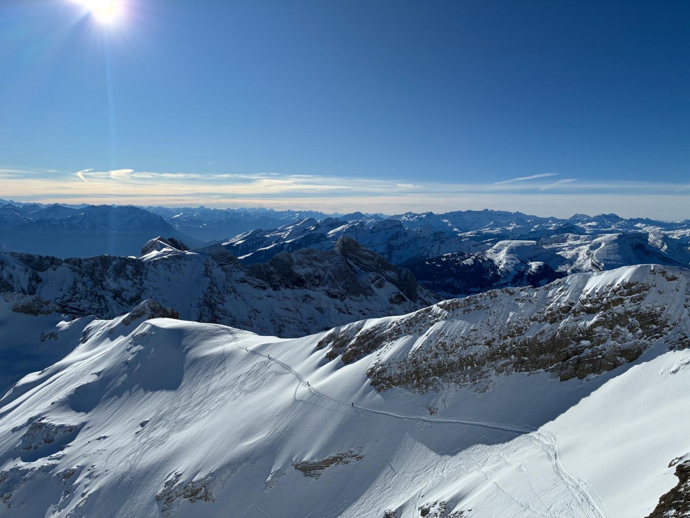 Nur Abfahrt, dafür mit Aufstieg ab Mesmerkamin zur Scharte des Chammhaldenweg.