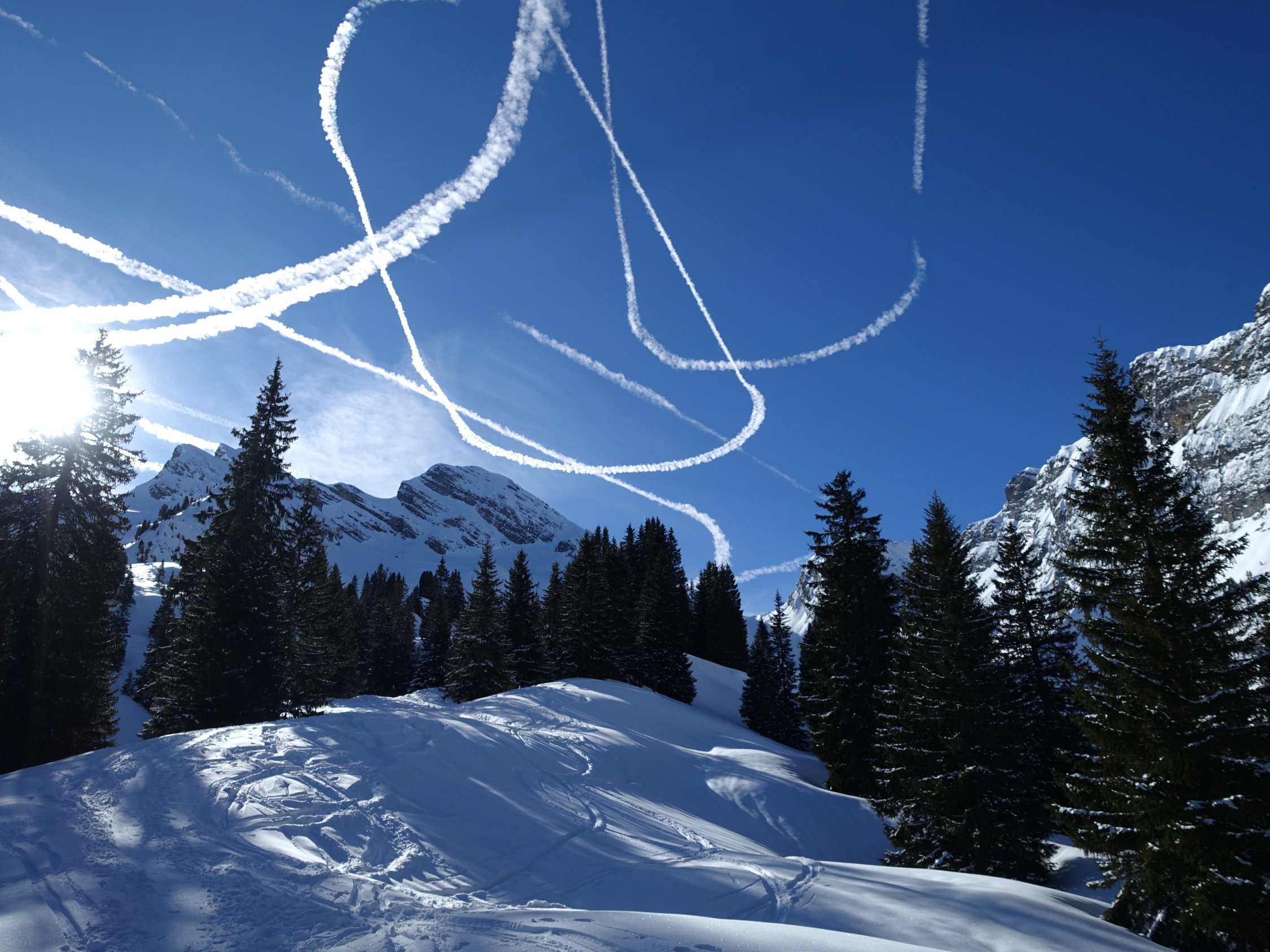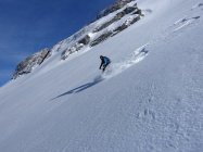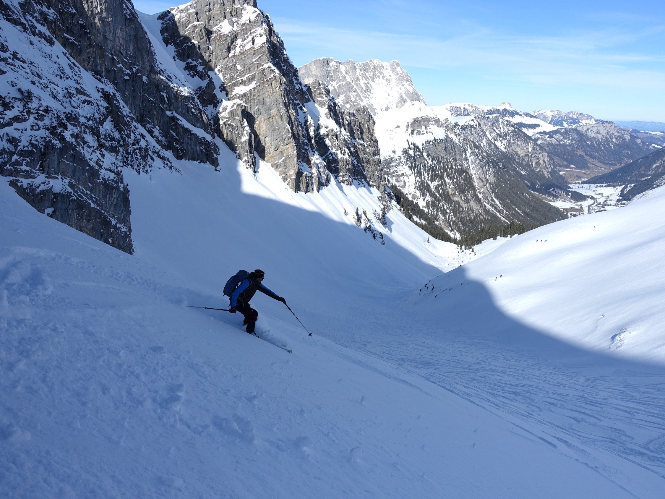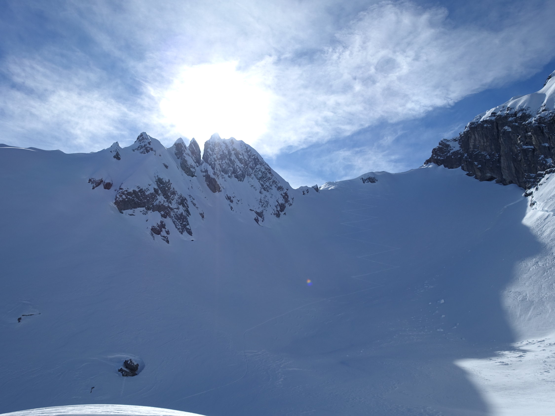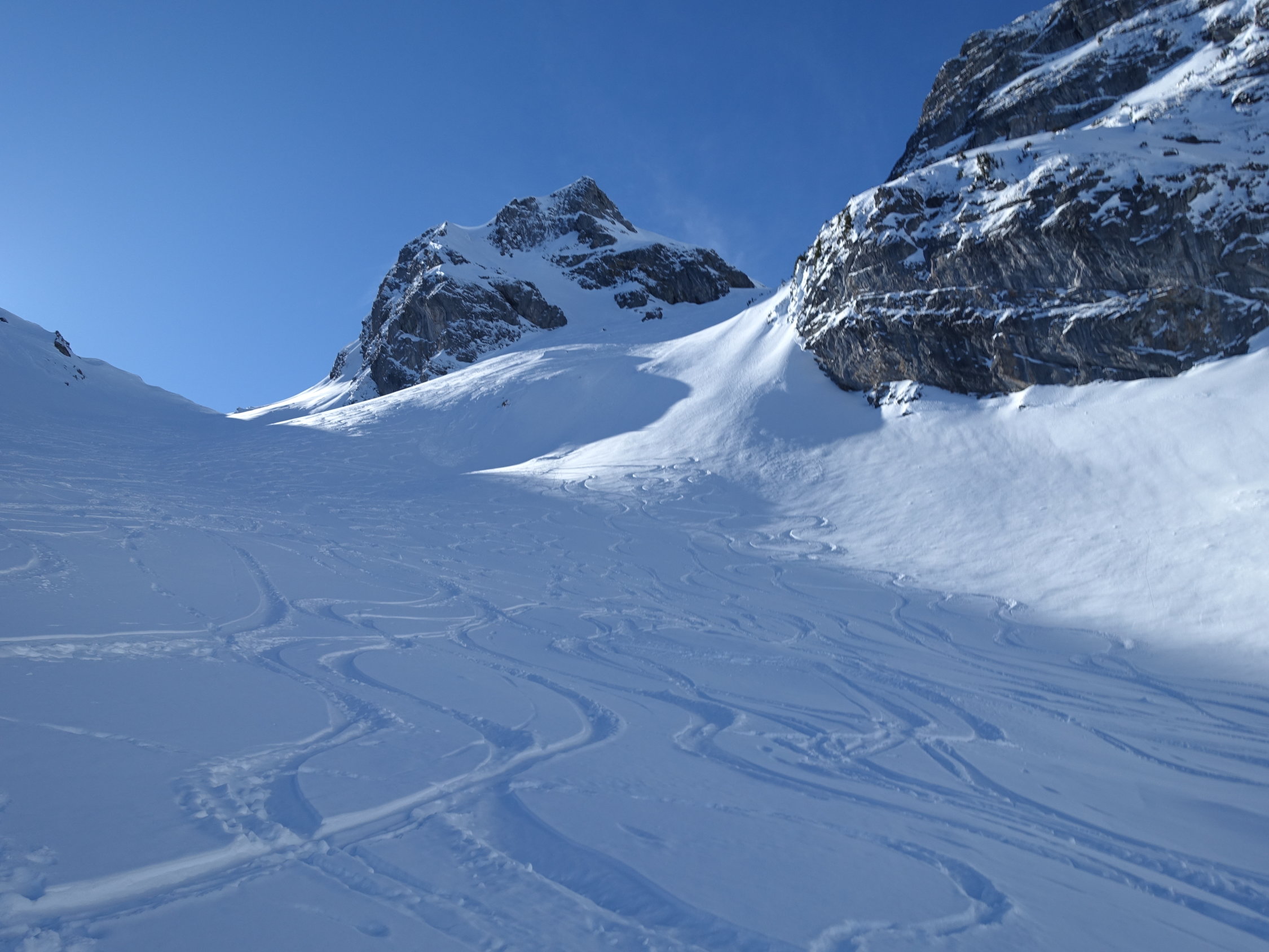 Pulver arg zerpflügt, oben finden sich noch ein paar freie Stellen für ein paar schöne Schwünge. Leider hat der Wind gegen den Grat hin den Pulver mehrheitlich gepresst, keine Freude für meine noch nicht ganz geheilten Gelenke; es bessert mit jeder Tour...