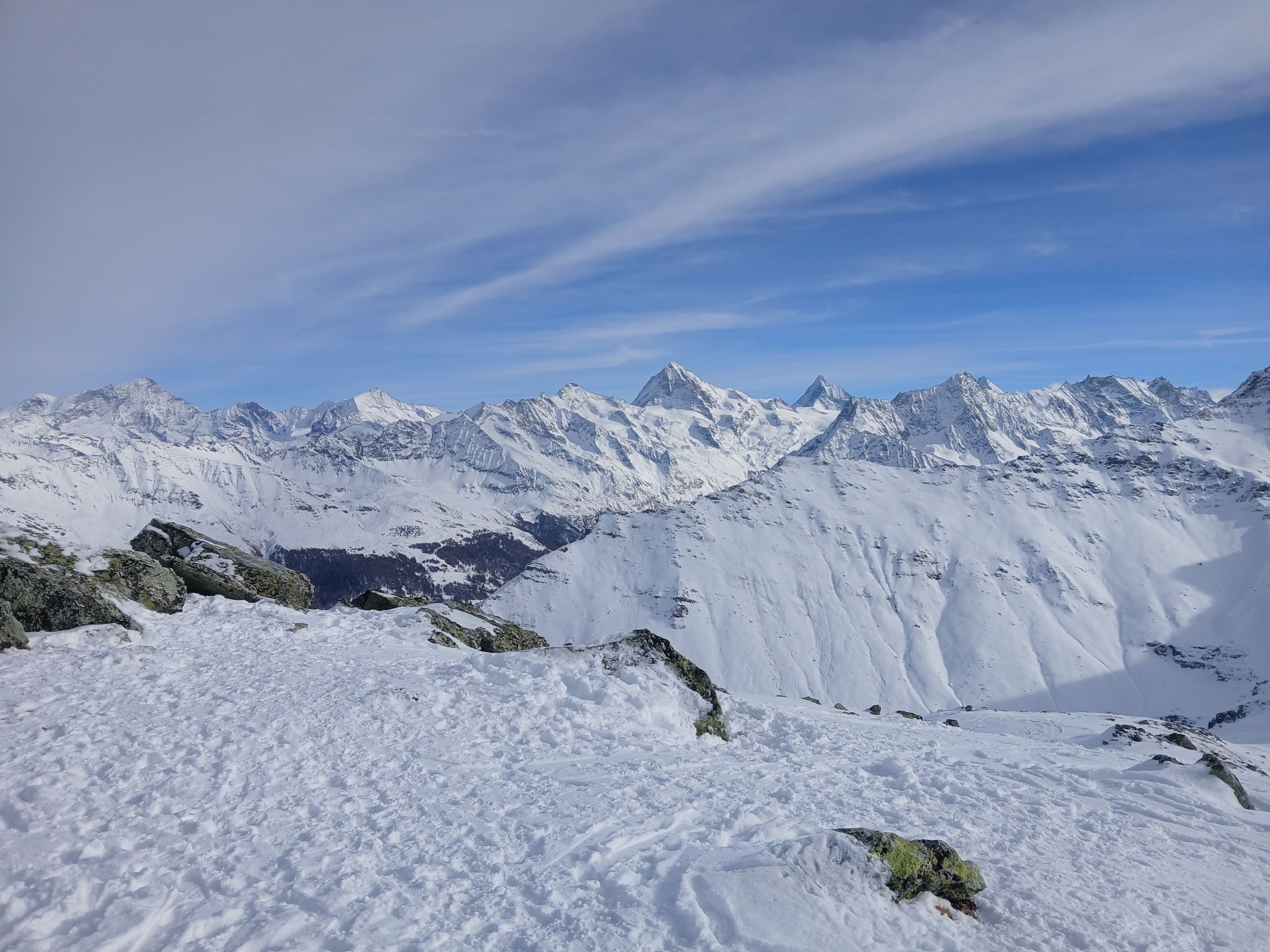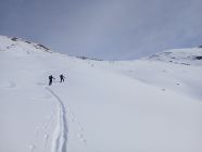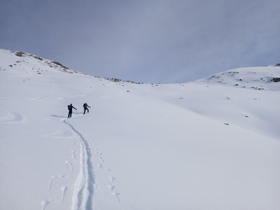 Skis müssen getragen werden bis ober dem Wald. Nur von Noveli gibt es genügend Schnee aber regelmäsig Steinkontakt. Oberhal 2700 meter 2 whuuums gehabt. Im Abfahrt sind wir nach Les Plaches abgefahren. Das Blockenfeld durchqueren ist sehr mühsam. Dan über den Weg nach Mayens de Méribé geht gut. Der Weg zurück nach Pralong hat Schnee. Vielleicht etwas besser als der Gleiche Weg durch dem Wald nach Pralong.