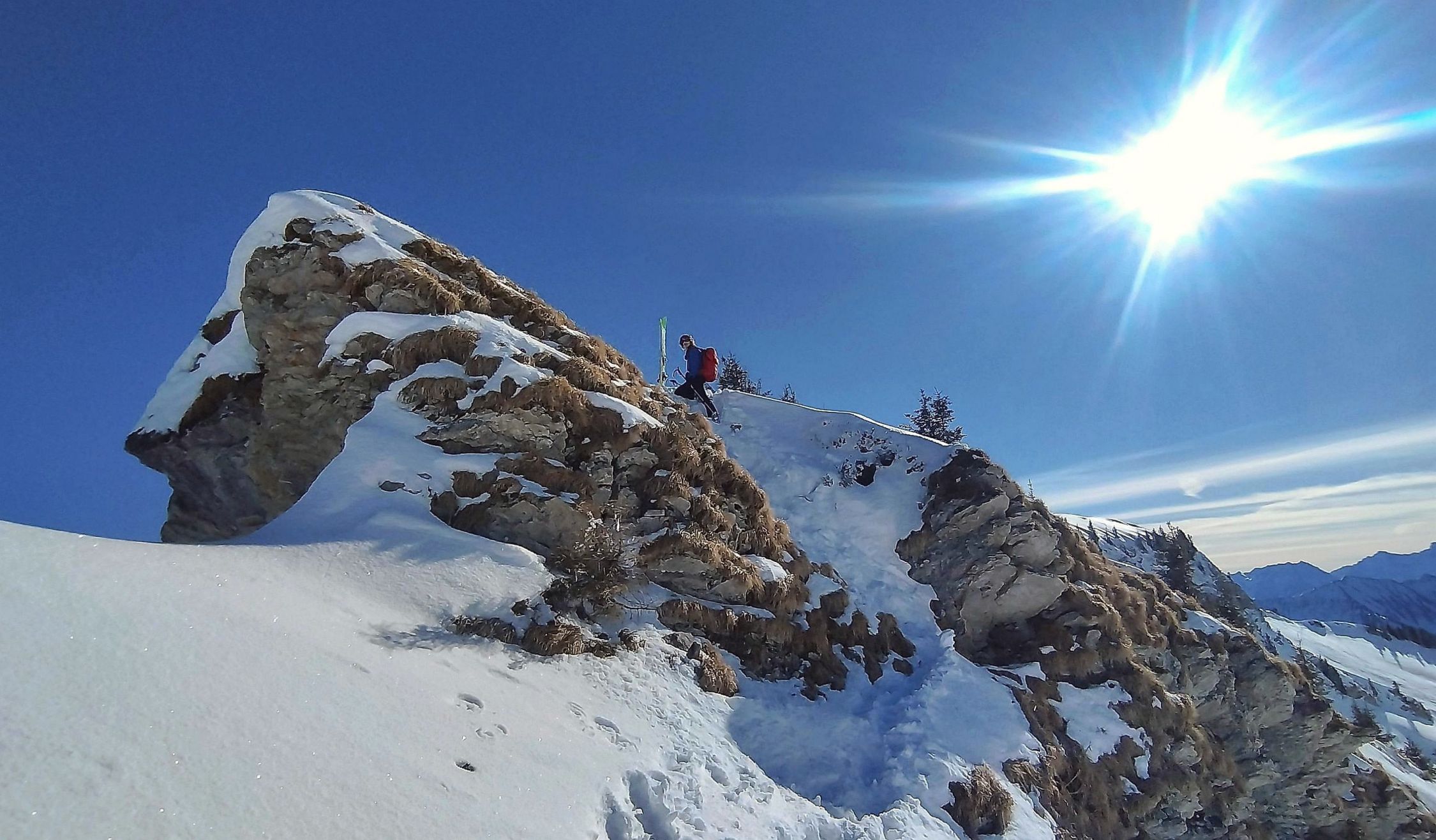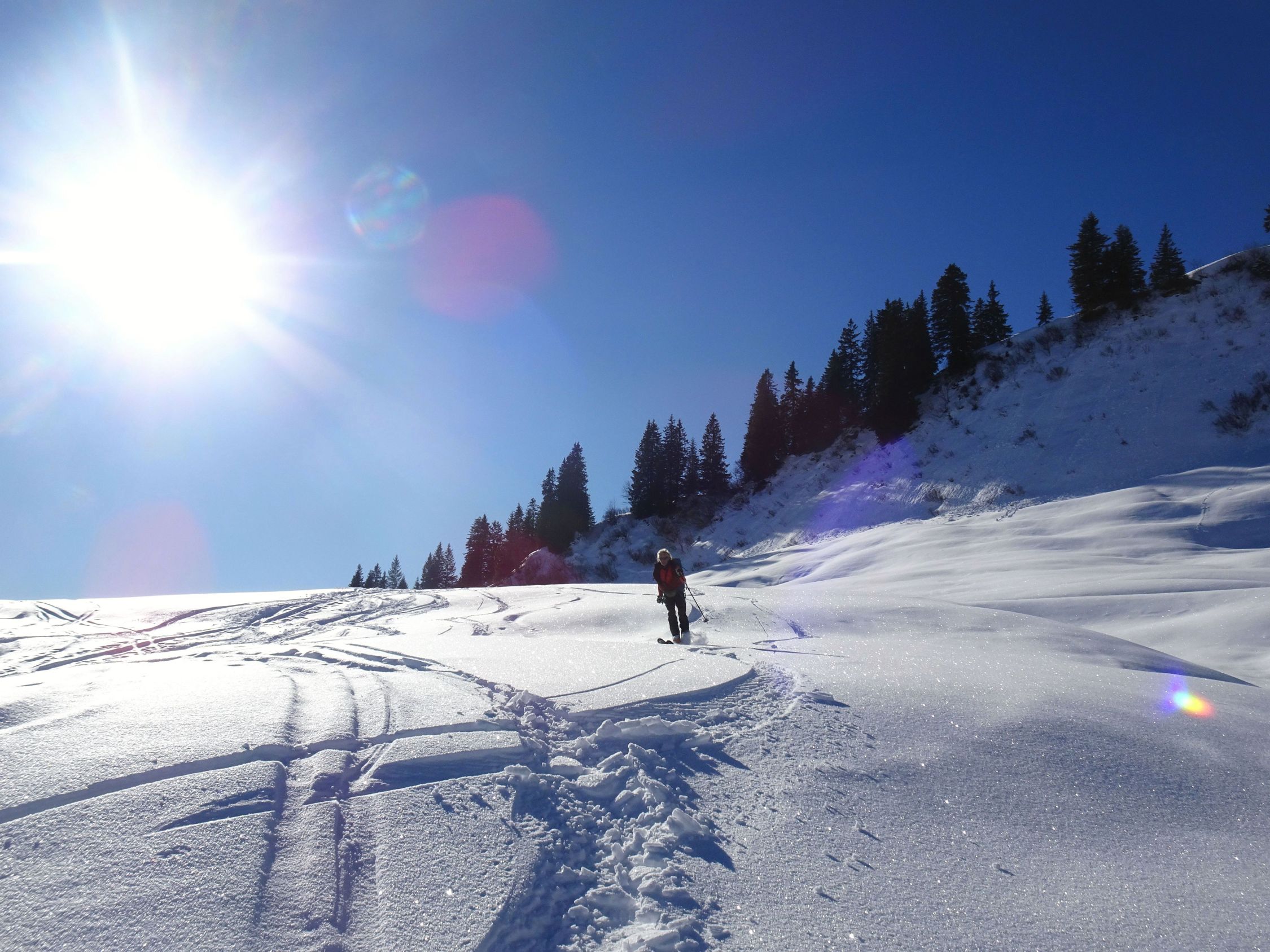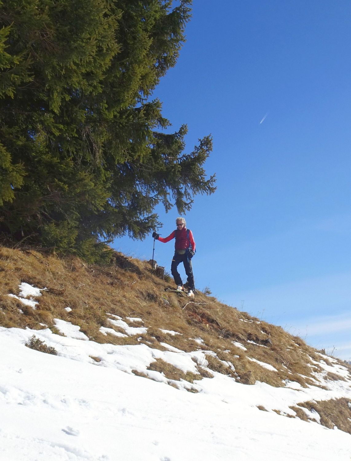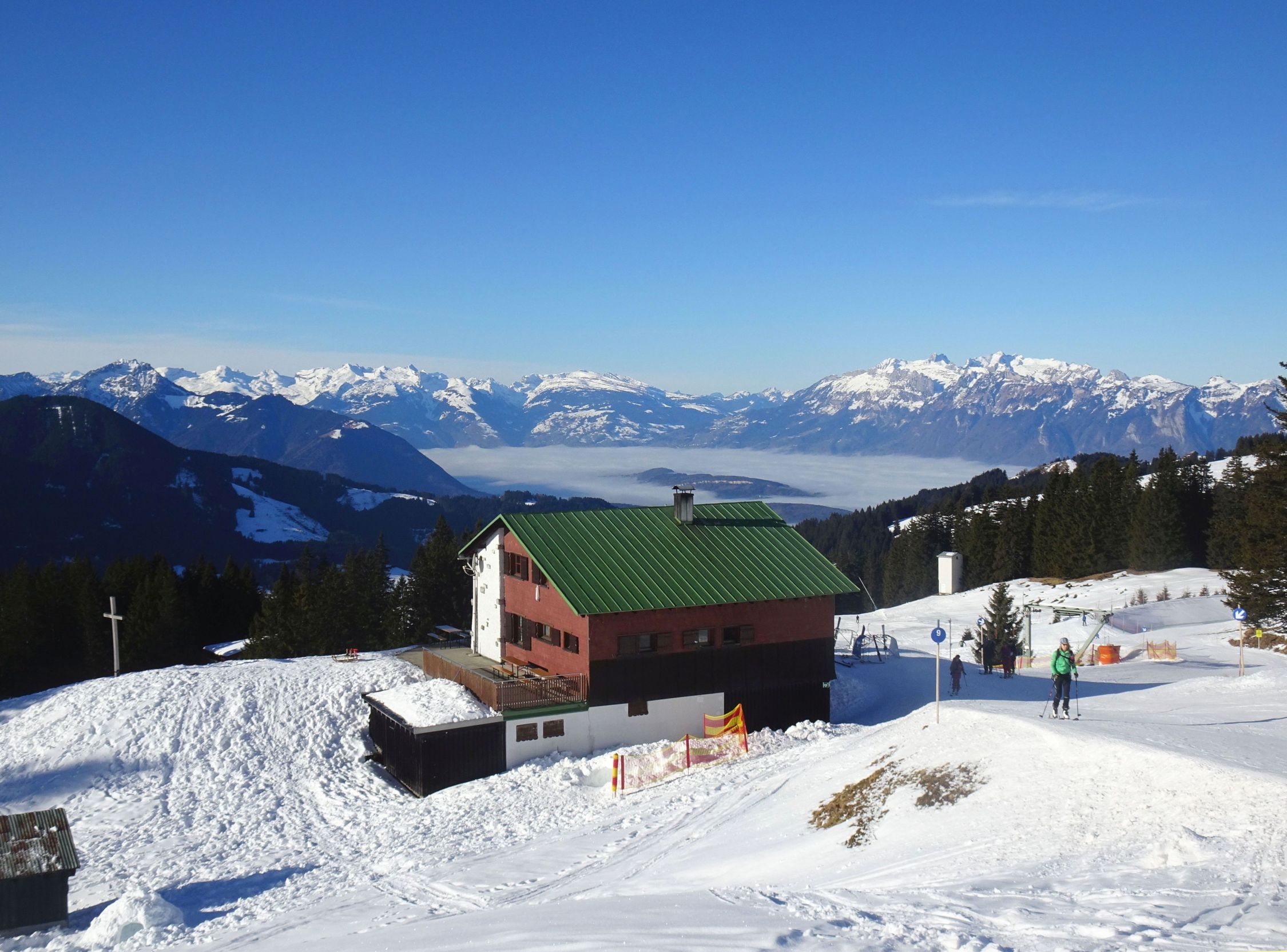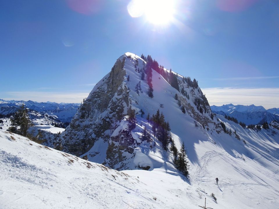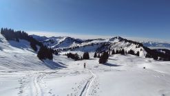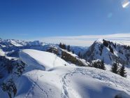 Wetter sonnig und blauer Himmel mit bester Fernsicht, kaum Wind. Für die Jahreszeit sehr warm. Einige Leute im Gebiet unterwegs, wobei die meisten zum Hohen Freschen gingen. An den Mellenköpfen nur wenige Tourengeher getroffen.