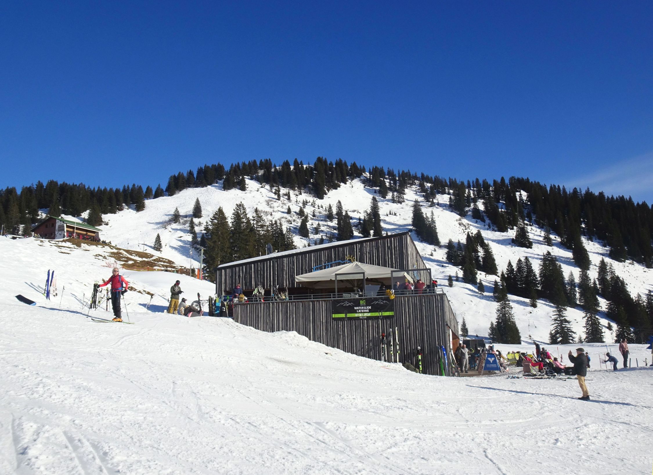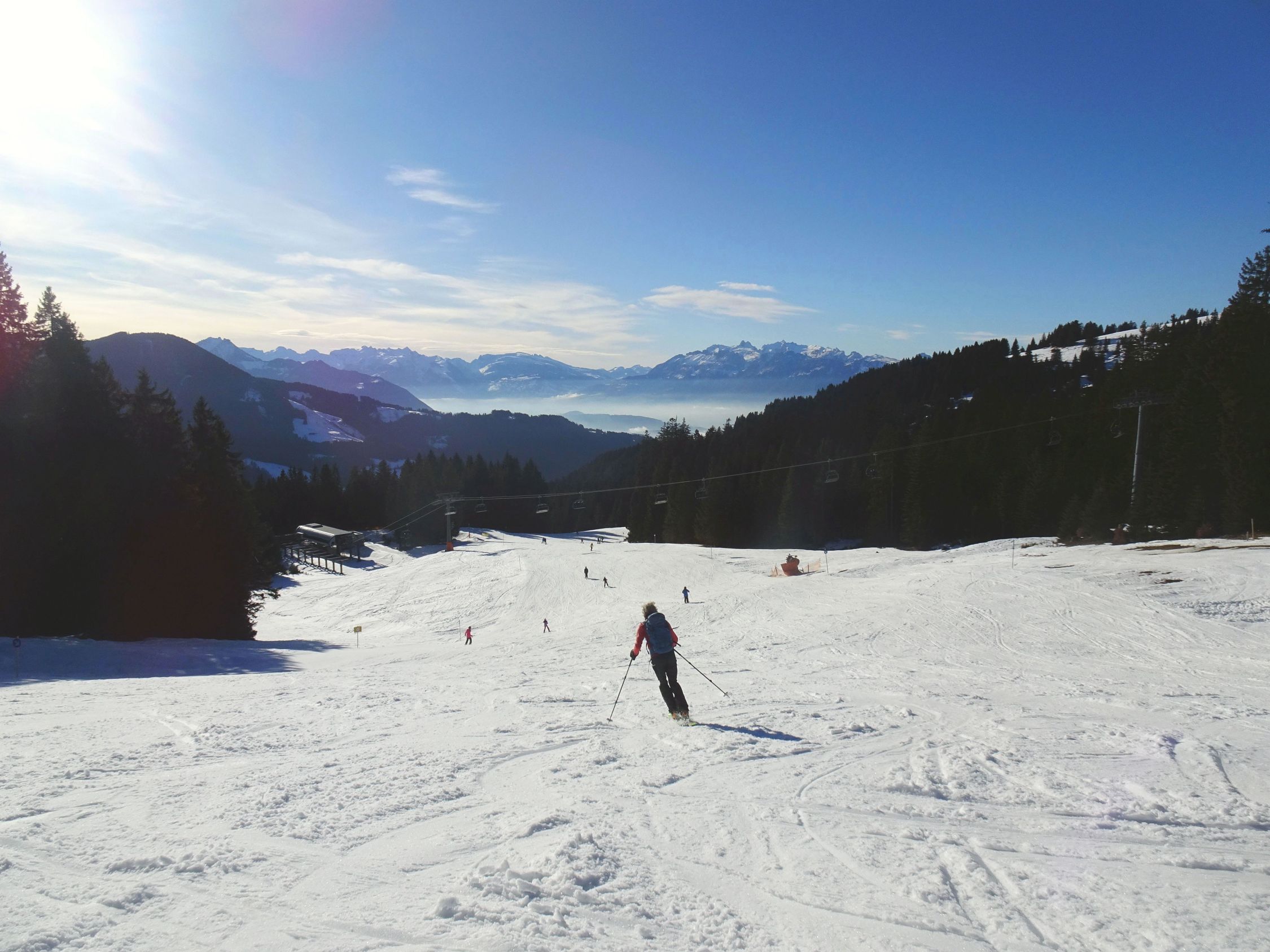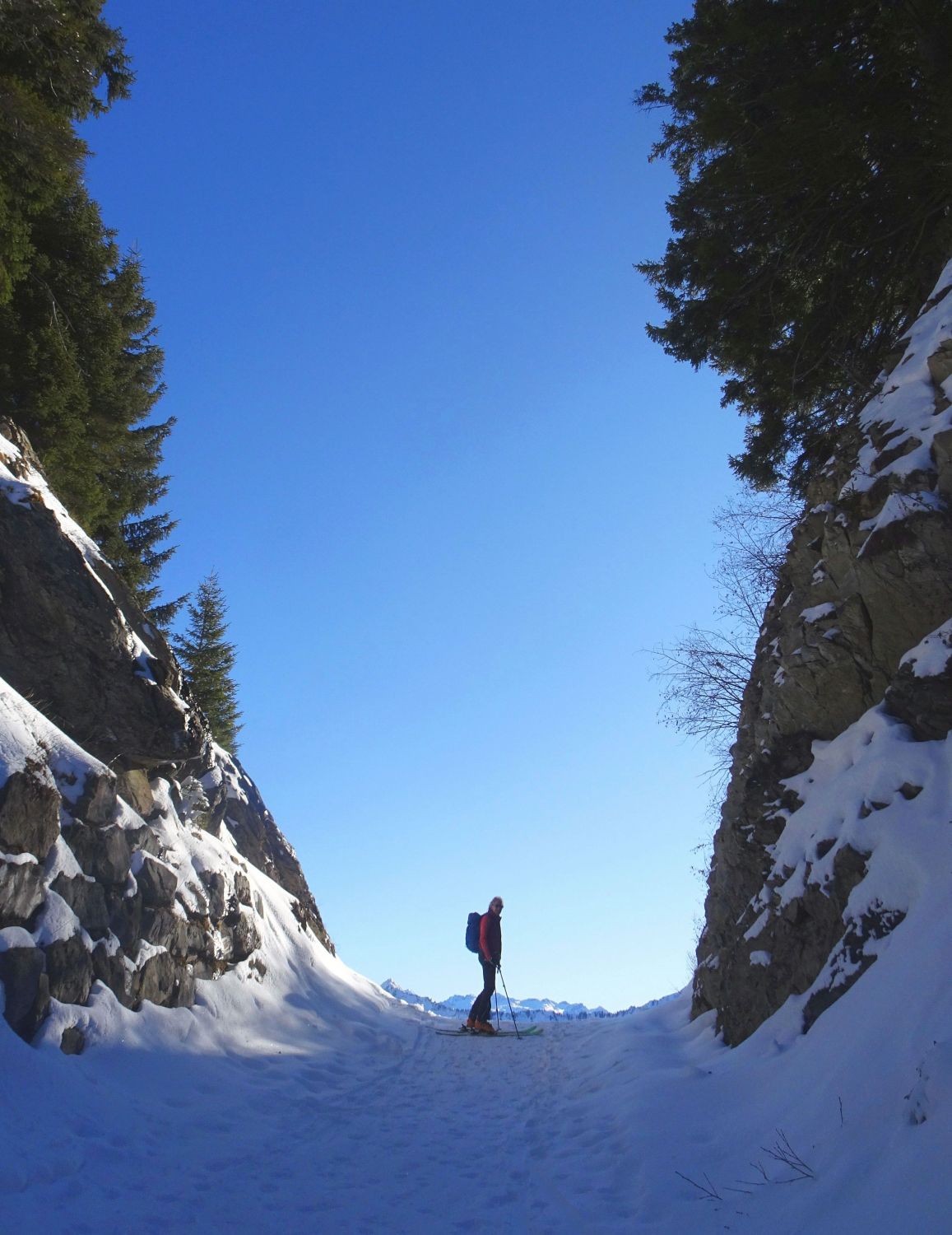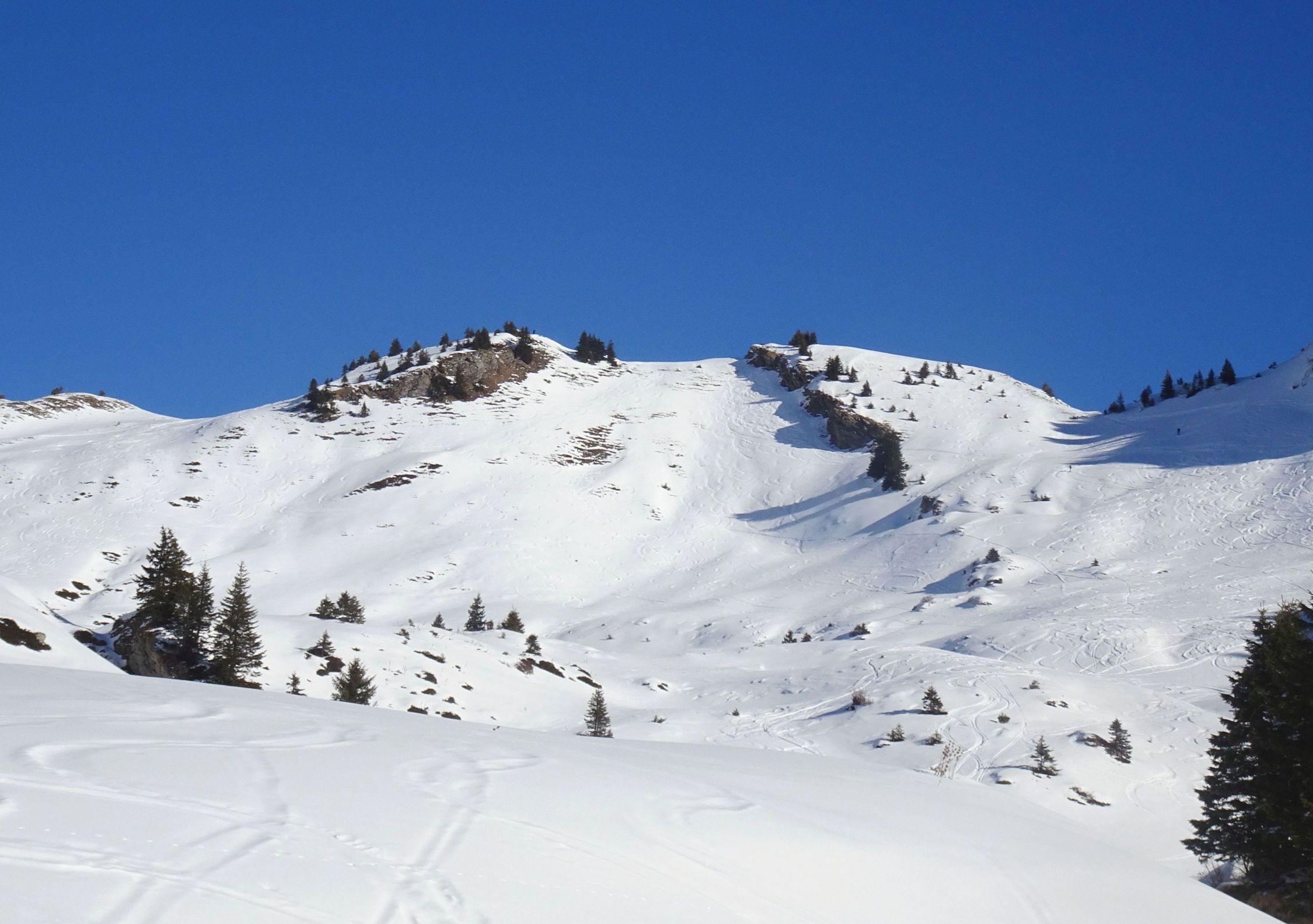 Wetter sonnig und blauer Himmel mit bester Fernsicht, kaum Wind. Für die Jahreszeit sehr warm. Einige Leute im Gebiet unterwegs, wobei die meisten zum Hohen Freschen gingen. An den Mellenköpfen nur wenige Tourengeher getroffen.