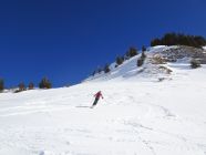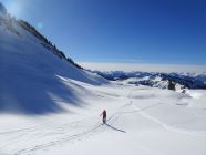 Abfahrt bessere Verhältnisse als erwartet. Im oberen Teil etwas Pulverauflage auf tragendem Untergrund. Am besten fahrbar in eher flacheren und westexponierten Hängen, kurze südseitige Passage weiter unten schon firnig. Talabfahrt auf der Piste schöner Sulz.