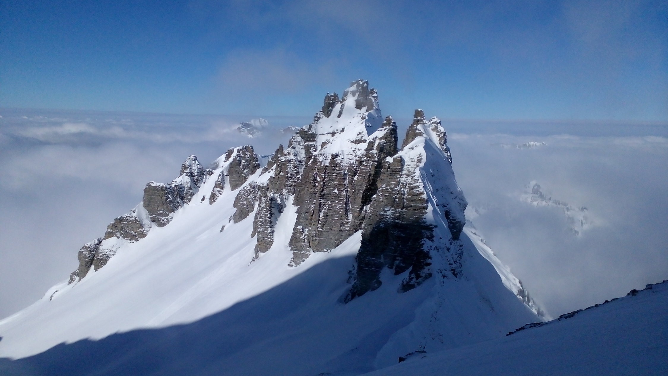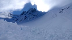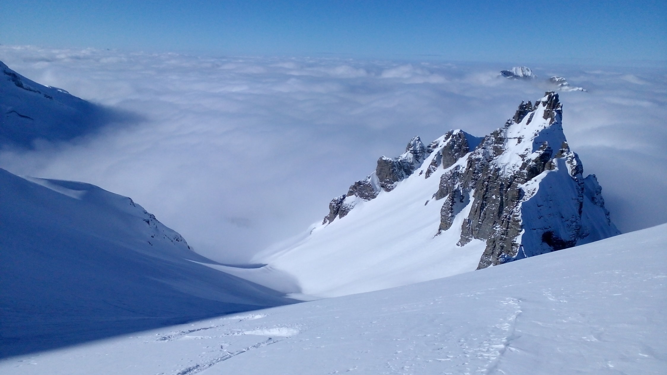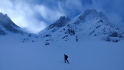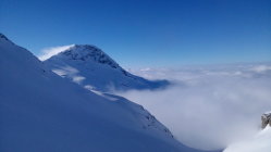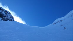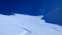 Bis ganz oben sehr gut zu gehen, mit Harscheisen, doch problemlos. Ein, zwei kurze windgepresste Stellen etwas heikel, da wenig Haltefläche am Steilhang, insgesamt aber sehr gut machbar. Auf der rechten Seite eine grössere Wechte, linksseitig problemloser Ausstieg aus dem Hang. Oben perfekter Pulver von 20 cm. Die Abfahrt lockt schon jetzt.