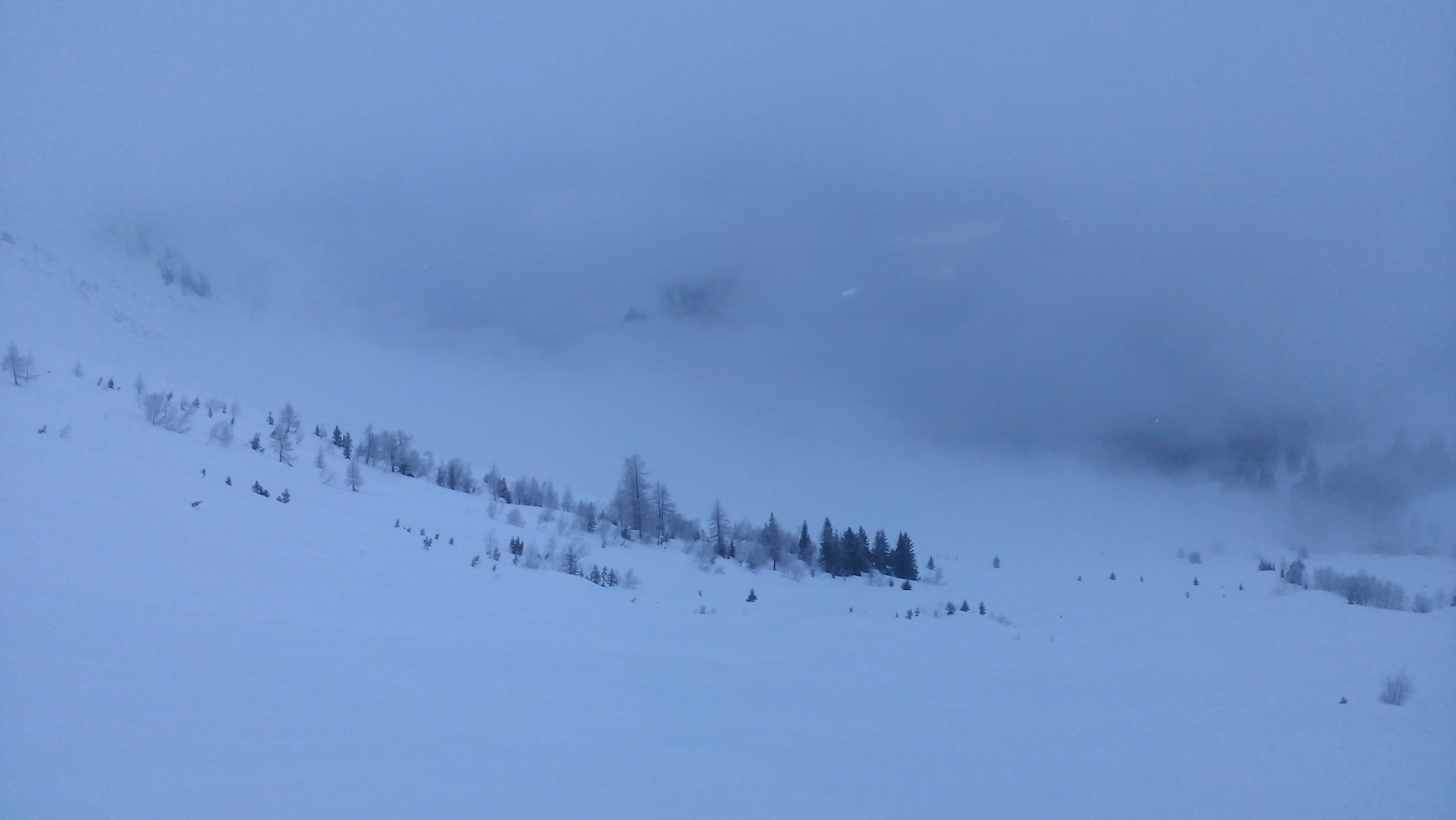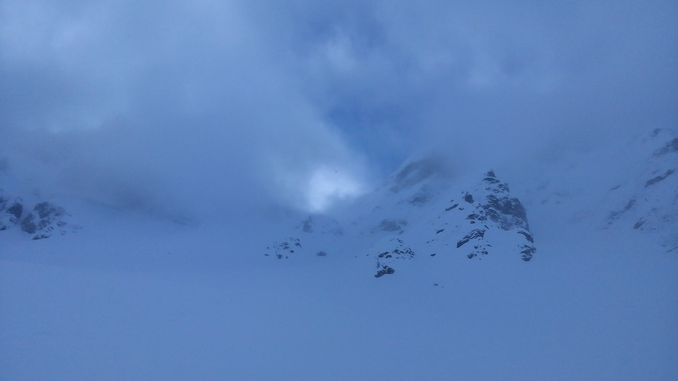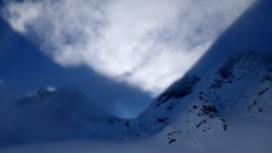 Wenig Sicht bis zur "Abzweigung" rechts hoch zum Landfogtehore, nach einigen Spitzkehren dann das Staunen. Ein Hauch von Blau, genau dort, wo wir hinwollen, am obersten Ende des Steilhanges - und wirklich, es tut auf. Umhüllt von Wolken schauen wir gebannt zum blauen Fleck und ziehen unsere Spur weiter.