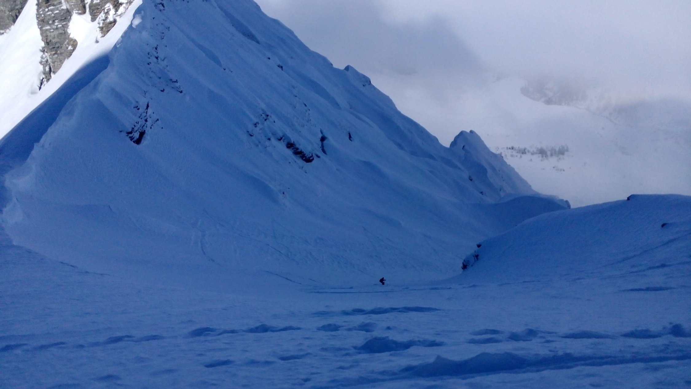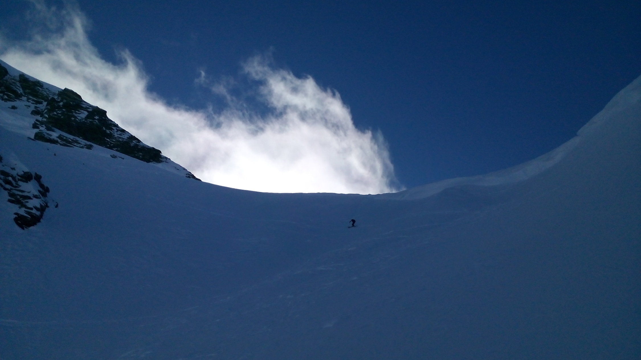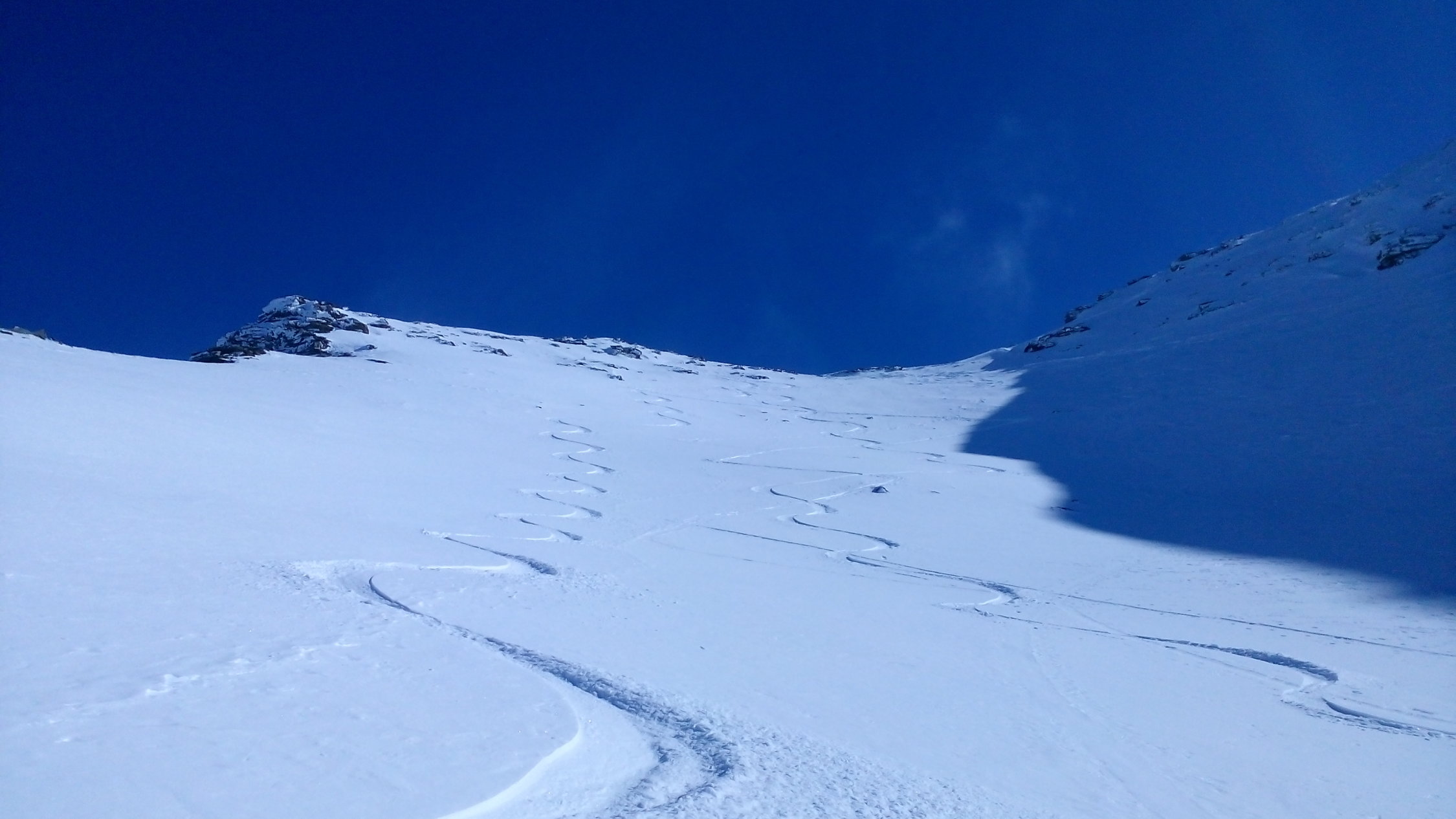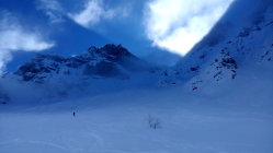 Eine traumhafte Abfahrt, erst Pülverchen, am Steilhang recht stark verfahren, teilweise windgepresst, aber schön, weiter unten mehr Auswahl und tiefer Pulver mit vielen alten Spuren drin.