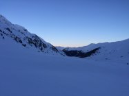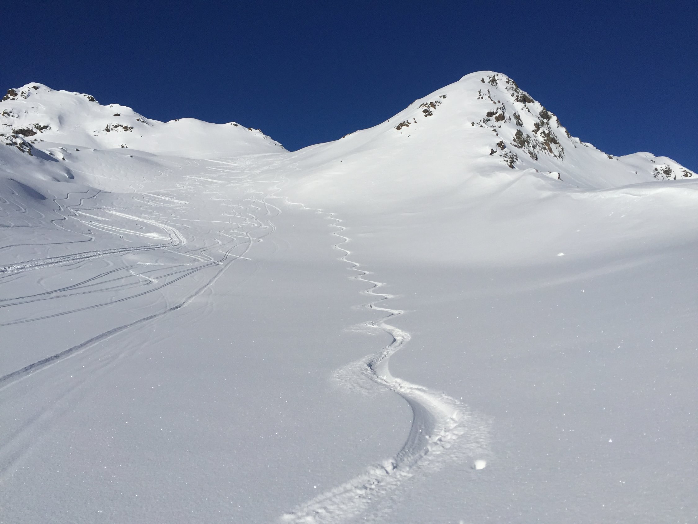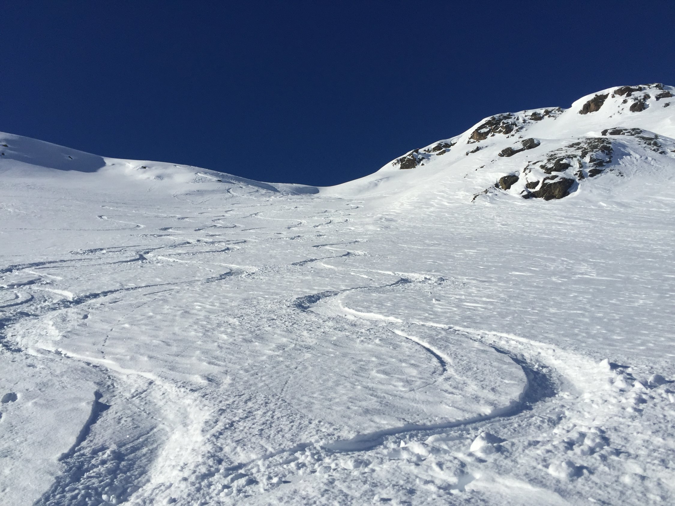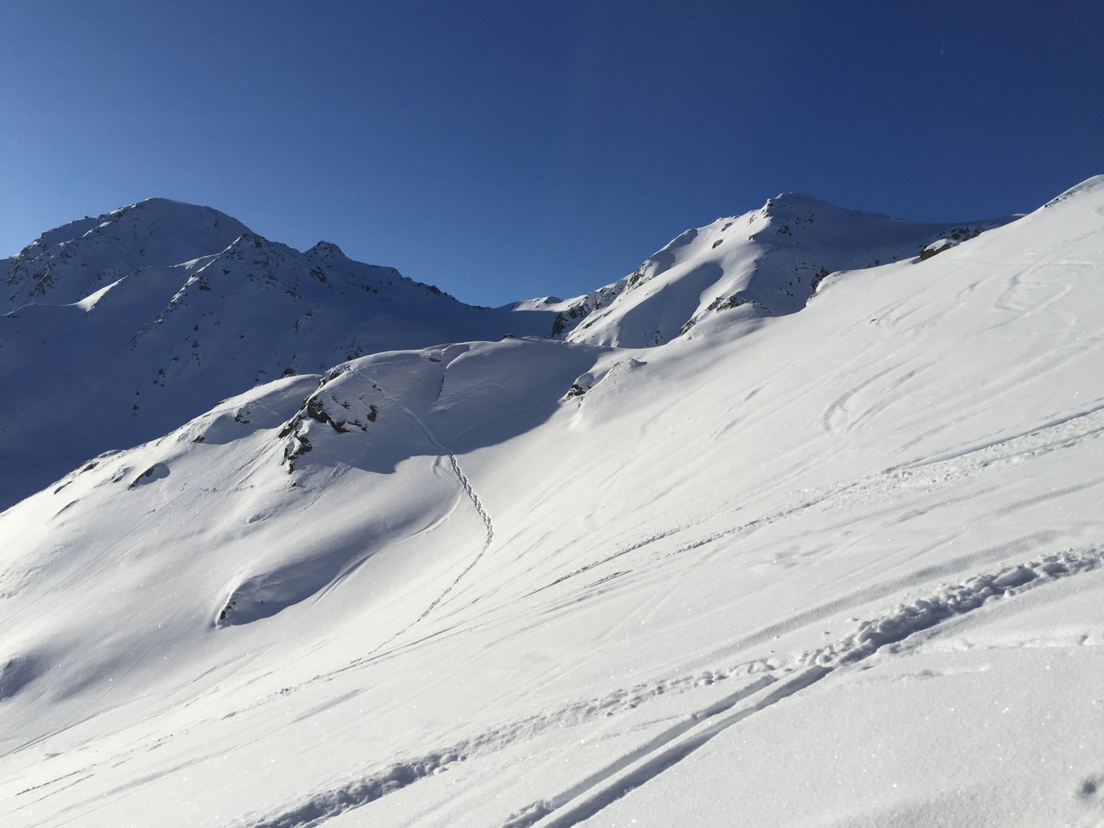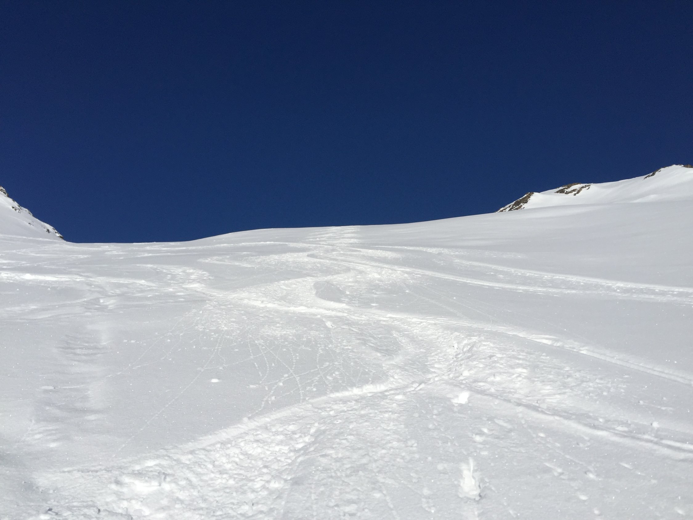 Nach dem Isenfürggli am Dienstag heute nochmals eine lohnende Vorfrühstückstour. Start bei knackigen -12Grad bei Tschuggen. Aufstieg ohne Harscheisen problemlos machbar. Auf dem Plateau nach den ersten beiden Hängen angelangt, sah ich, dass der schöne Hang am Sentischhorn bereits sehr verfahren war. Dagegen hatte es am Baslersch Chopf noch Platz für eigene Spuren. Sehr schöner Aufstieg durch den in der Sonne glitzernden Reifschnee. Betreffend Abfahrt ist die direkte Nordabfahrt auch schon recht verspurt. Daher fuhr ich zunächst den Gipfelhang auf der Aufstiegsroute, Danach dann Einfahrt in die steilen Hänge zur Passtrasse hinunter. Fast alles war schöner Pulver, nur grad die untersten Meter waren teils Windharsch, dem man aber bei geschickter Hangwahl ausweichen konnte.