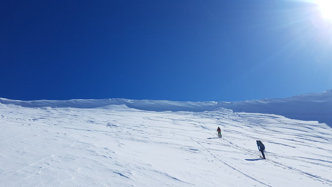Abfahrt oben Pulver, in der Mitte hart und abgeblasen, dann Pulver und Bruchharsch. Hatten im Aufstieg bis ca 2600m zähen Nebel, in der Abfahrt löste sich dieser ab 2500m zum Glück auf... war aber höher gestiegen.