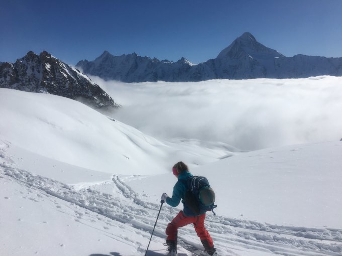 Ausgezeichnete Verhältnisse im Gebiet. Ab ca 2800m sonnig, jedoch mit kaltem Wind.