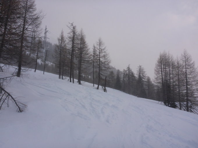 Habe mit besserem Wetter spekuliert. Nach einem Blick in Richtung Gipfel beim Start habe ich den Gipfel schon abgeschrieben. Beim Aufstieg zum ersten Mal den "richtigen" Hüttenweg mit Ski genommen.Sehr gute Spuranlage, auf harter Spur, bei den Traversen im Wald Harscheisen montiert. Der Aufstieg bis zu Capanna Piansecco war praktisch im windstillen Bereich. Bei der Capanna fegte dann schon ein starker Wind aus nordwestlicher Richtung. Das Wetter war sehr wechselhaft, einmal bessere, einmal schlechtere bis sehr schlechte Sicht. Beim Übergang Richtung Pass auf Höhe 2190 entschied ich mich für den Abruch der Tour. Die Abfahrt über den Südhang auf tragendem Windharsch Schnee. In den Mulden noch Pulverschnee. Weiter oben vermutlich auch. Im unteren Teil Südhang Expsition hart und ruppig. Osthang Exposition pulvrig, im untersten Waldstück dann beides angetroffen.