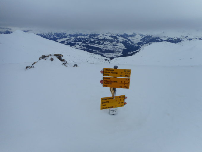 Abfahrt auf Route 172B nach Peist war sehr schön zum Fahren. Leider hatten wir auf dem Rücken vom Gipfel nach Nordwesten schlechte Sicht, danach sehr gut fahrbare Hänge mit leichter Pulverauflage auf relativ gut tragender harter Unterlage.