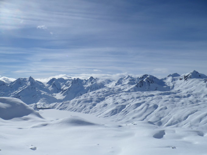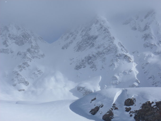 Wunderbare Pulververhältnisse dank viel Wind am Samstagabend (Verwehungen). Zwischen den Bildern von der Kastellücke auf den Gletscherhang bis Rückkehr in die Kastellücke, war es ziemlich zu mit Schneefall viel Wind. Deshalb liessen wir den Gipfel auch aus. Danach wieder das schönste Wetter.