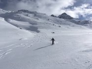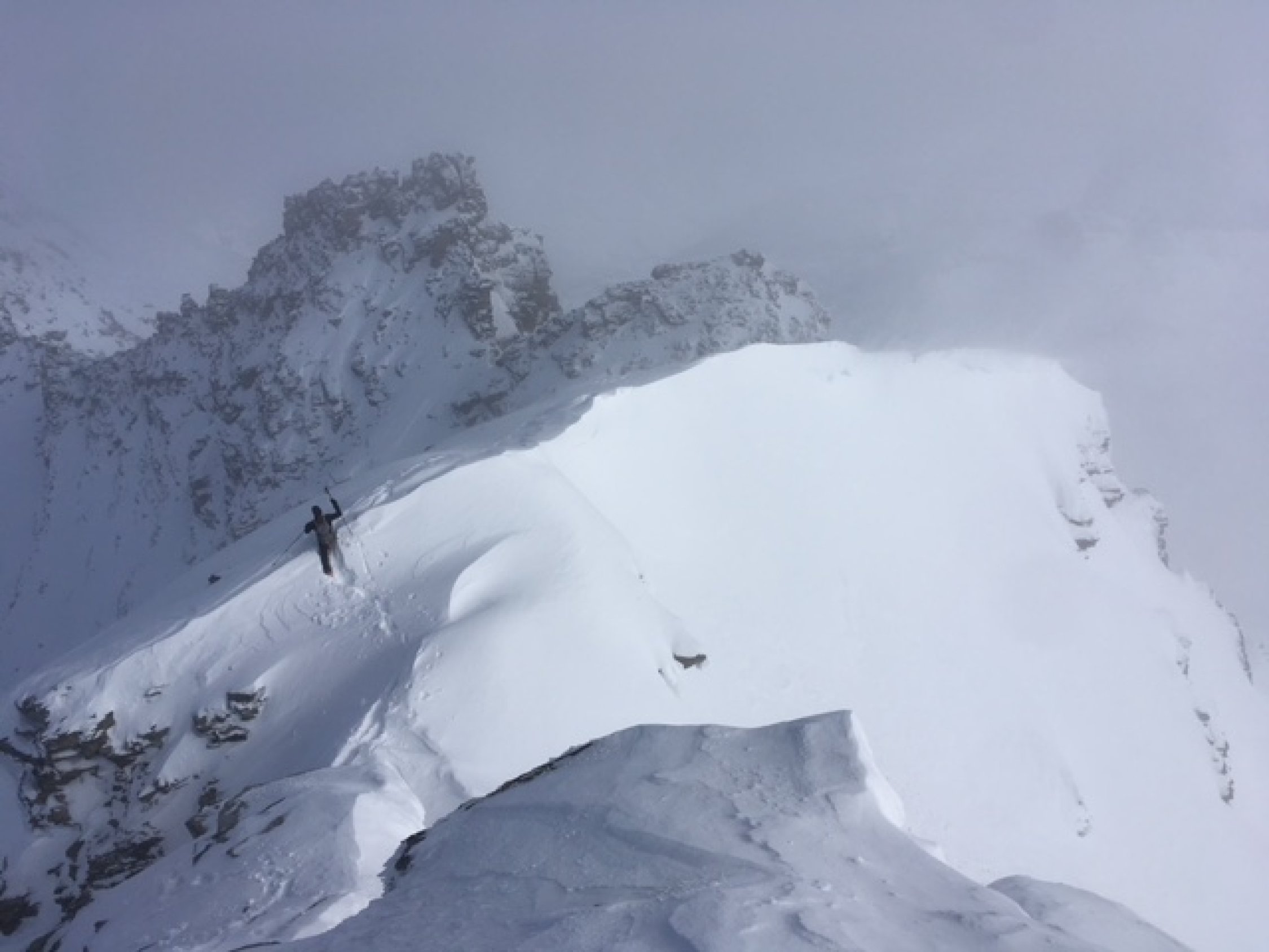 Von hier zu Fuss über den Grat auf den Gipfel. Im unteren Teil des Fussaufstiegs gibt es zwei Optionen: Entweder man klettert direkt über den Felskopf (wahrscheinlich Stellen II), oder man quert wie wir auf der N-Seite (Wühlschnee) bis das Gelände zu steil wird. Hier etwa 8m steil hoch durch ein Couloir auf den Grat. Der Schnee in diesem Couloir ist hart, Pickel und evtl. Steigeisen nützlich, aber nicht zwingend. Zuletzt über den leichten Schneerücken auf den Gipfel.