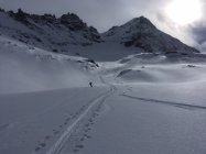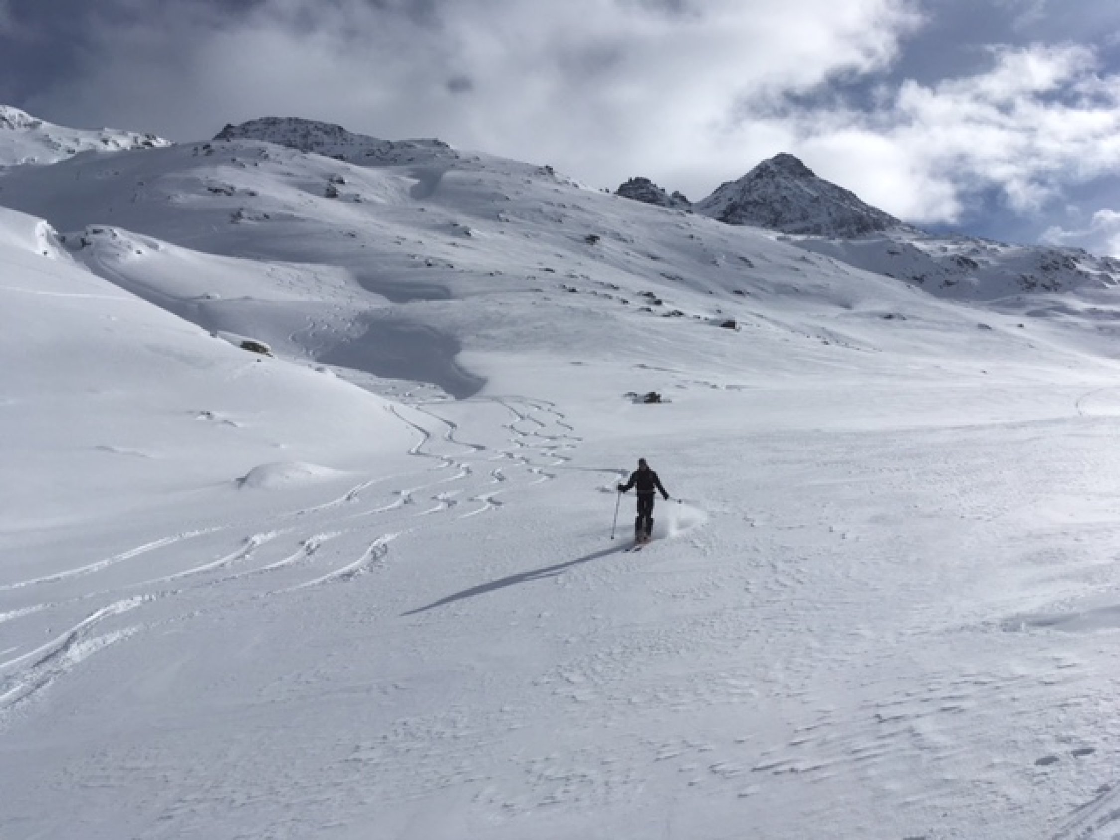 Abfahrt: Pulver gut, stellenweise leicht windbearbeitet, meistens aber schön zu fahren. Zuletzt durchs flache Tal und auf der Forststrasse nach Innerferrera zurück.