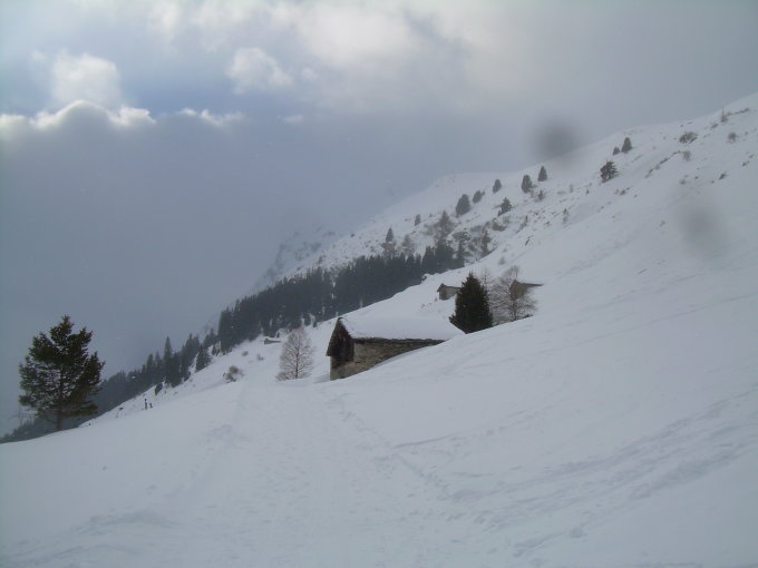 Perfekte Schneebedingungen, Anstieg auf guter Spur. Anfangs ließ auch das Wetter hoffen, indem sich immer wieder mal die Sonne zeigte. Wenn es schattig wurde, fühlte sich der Wind rasch kalt an. Im Gipfelbereich wurde dieser giftig, es war dort steinkalt, und die Aussicht blieb uns leider verwehrt. Nach 25 Minuten Wartezeit habe ich halb durchgefroren den Rückzug angetreten. Vladi, der nach mir den Gipfel erreichte, begrenzte die Dauer seines Aufenthaltes dort auf das Abfellen seiner Skier. Teils schlechte Sichtbedingungen dann im Abstieg bzw. in der Abfahrt. Das Gewölk sollte gemäß Wettervorhersage im Verlauf des Tages von den Gipfeln wegziehen, wir erlebten es leider umgekehrt.