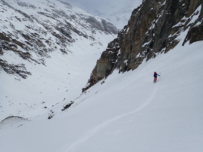 siehe oben, Anrisskante maximal 8cm, kleine Schneebrettchen zwischen Blöcken, den grossen Nordhang des Gipfels haben wir gemieden.