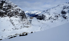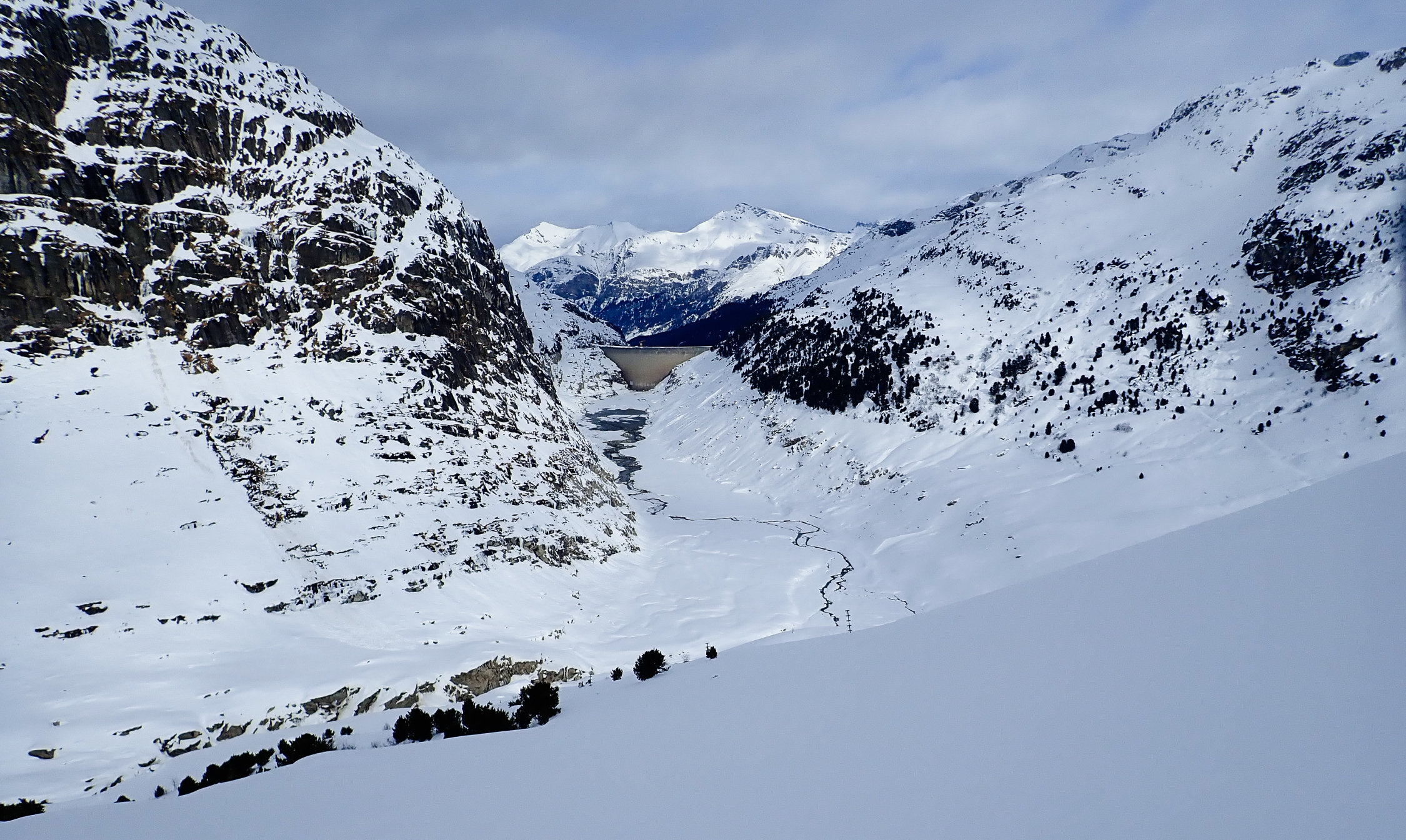 Dann herrliche Pulverschneeabfahrt bis zum Stausee.