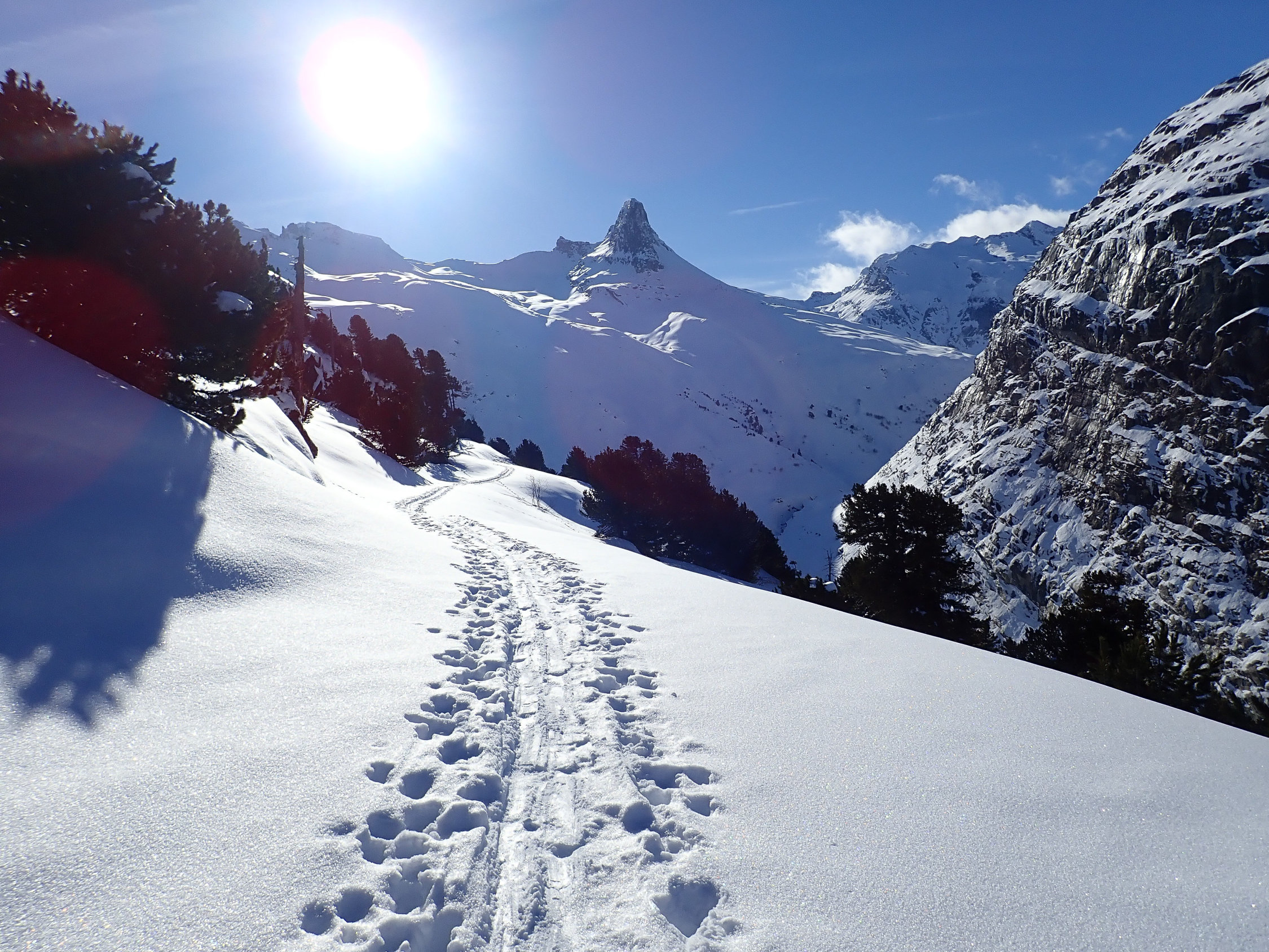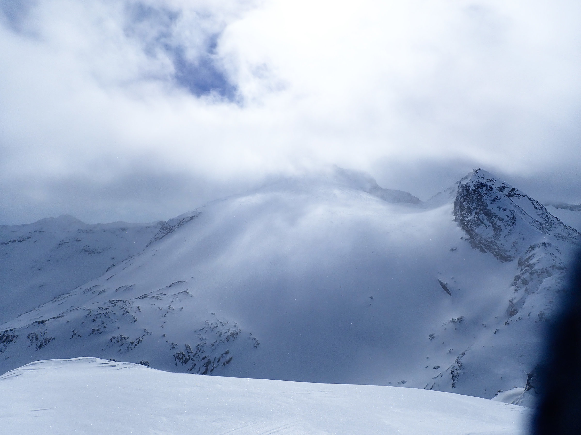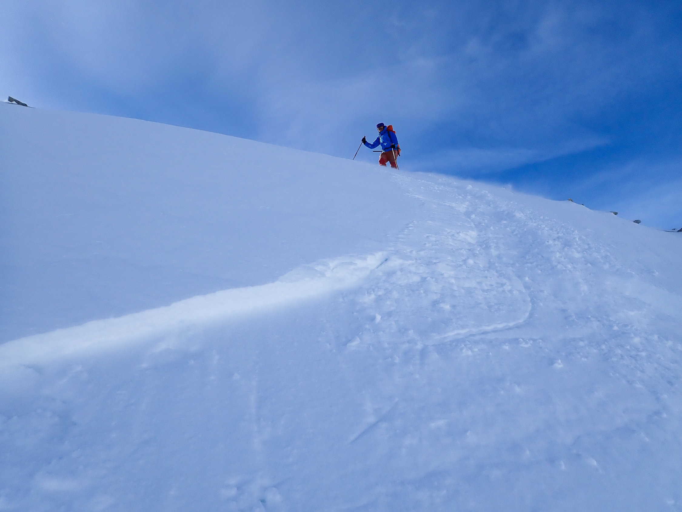 Bestens. Wenig lockerer Pulverschnee auf fester Unterlage. Schon im Aufstieg häufig in grösserern Schollen brechend. An Kämmen abgeblasen, Steinkontakt. Im Abstieg am Gipfelgrat frische Triebschneeansammlungen, die beim Betreten sofort auslösten.