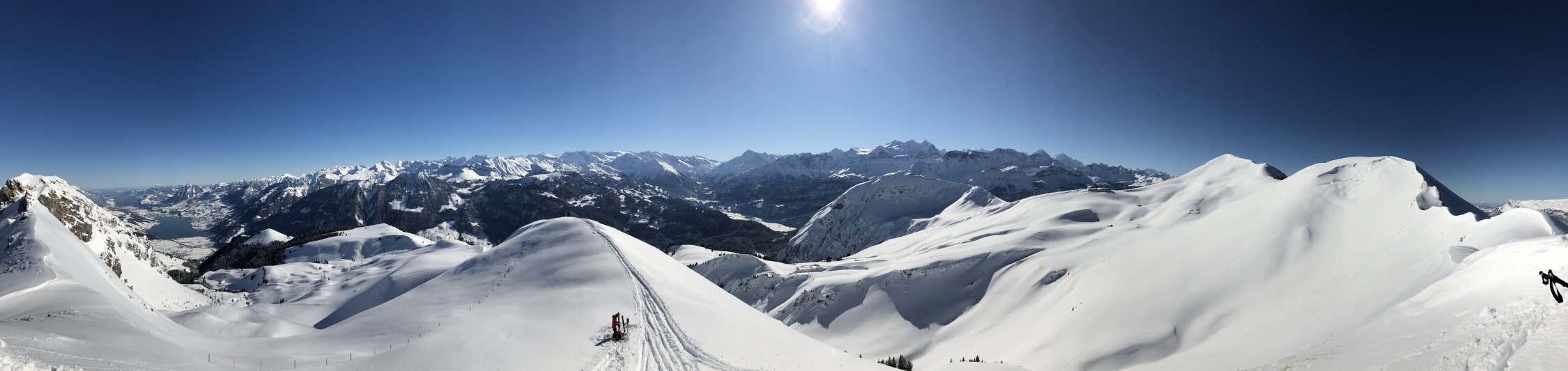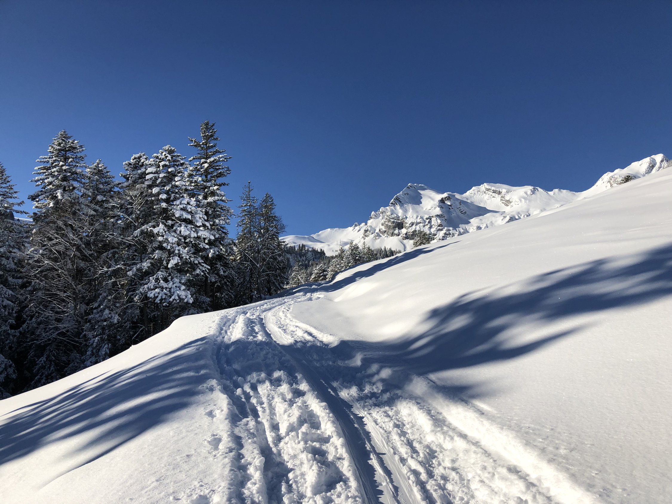 Tatsächlich traumhafte Verhältnisse. Wenige Spuren von gestern liessen heute freien Raum. Ohne Wind in der Sonne angenehm, aber doch immer kühl (-8° um 12:00 am Parkplatz).