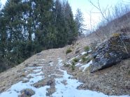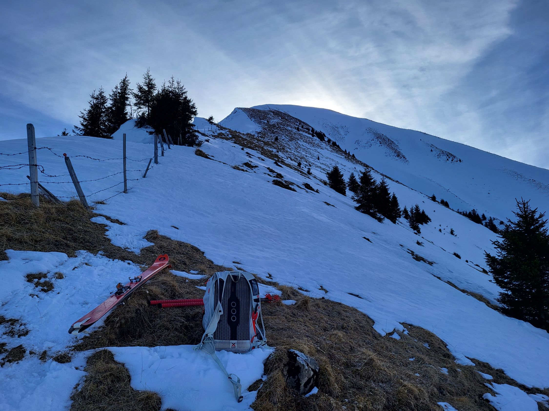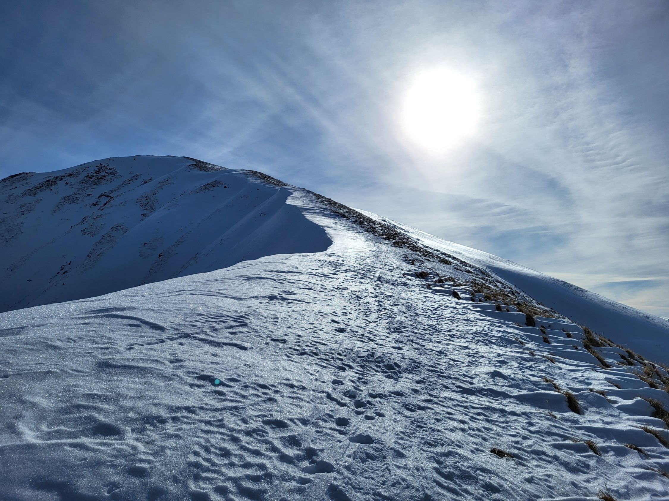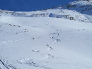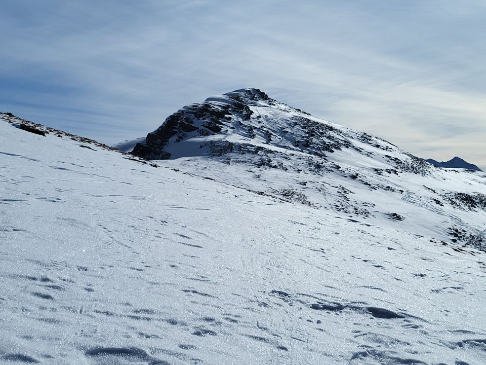 Von der Chirelsagi bis nach Bruni (Pt. 1404) hat es wenig Schnee, aber trotzdem musste ich nur ein kurzes Stück (ca. 50 m) zu Fuss gehen. Ab Bruni hat es genügend Schnee und eine gute Spur für den Aufstieg zum NW-Grat. Dieser ist abgeblasen und erfordert einen Aufsteig zu Fuss. Ab der Kuppe (ca. 2140 m) kann man wieder mit den Skis aufsteigen. Ich bin bis kurz vor den Gipfel auf den Skis geblieben, obwohl es unter dem steinigen Gipfelaufbau ab 2350 m bereits viele Fusspuren hat.