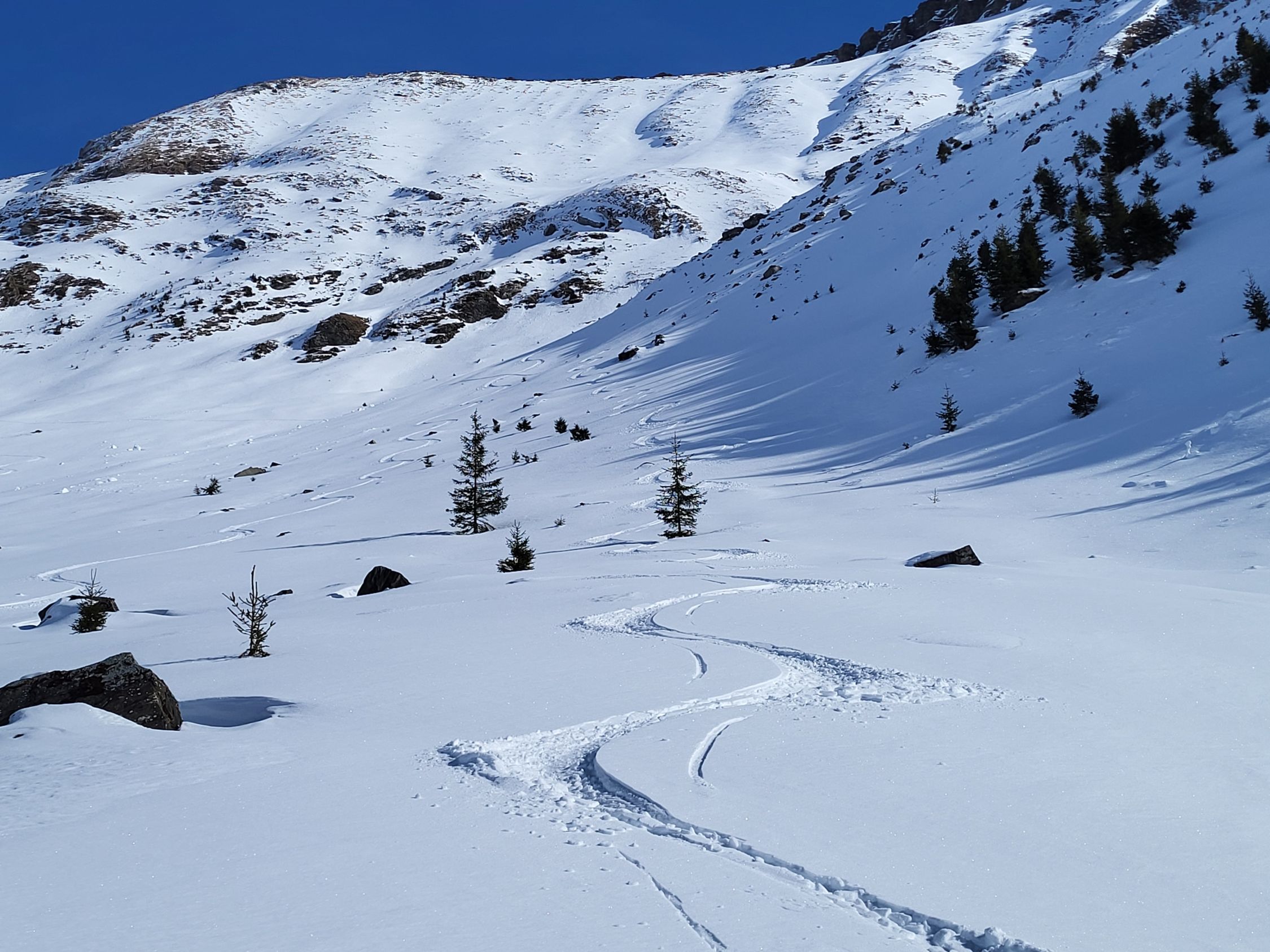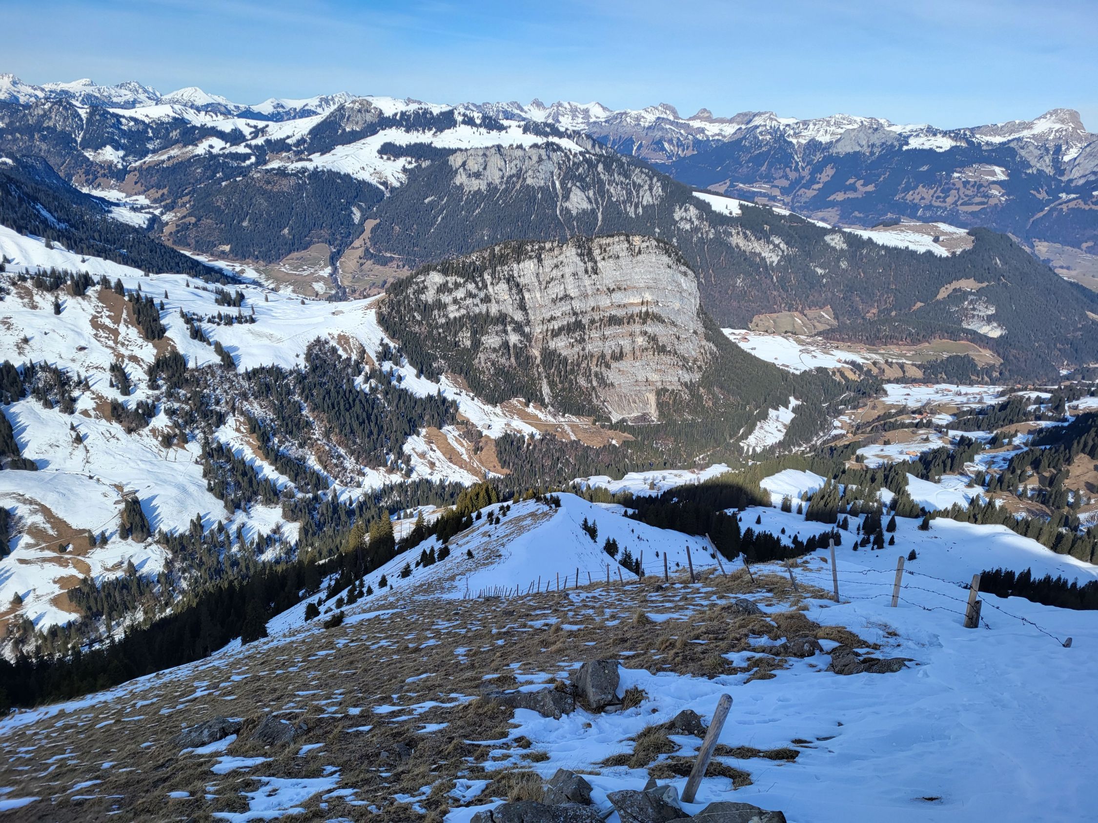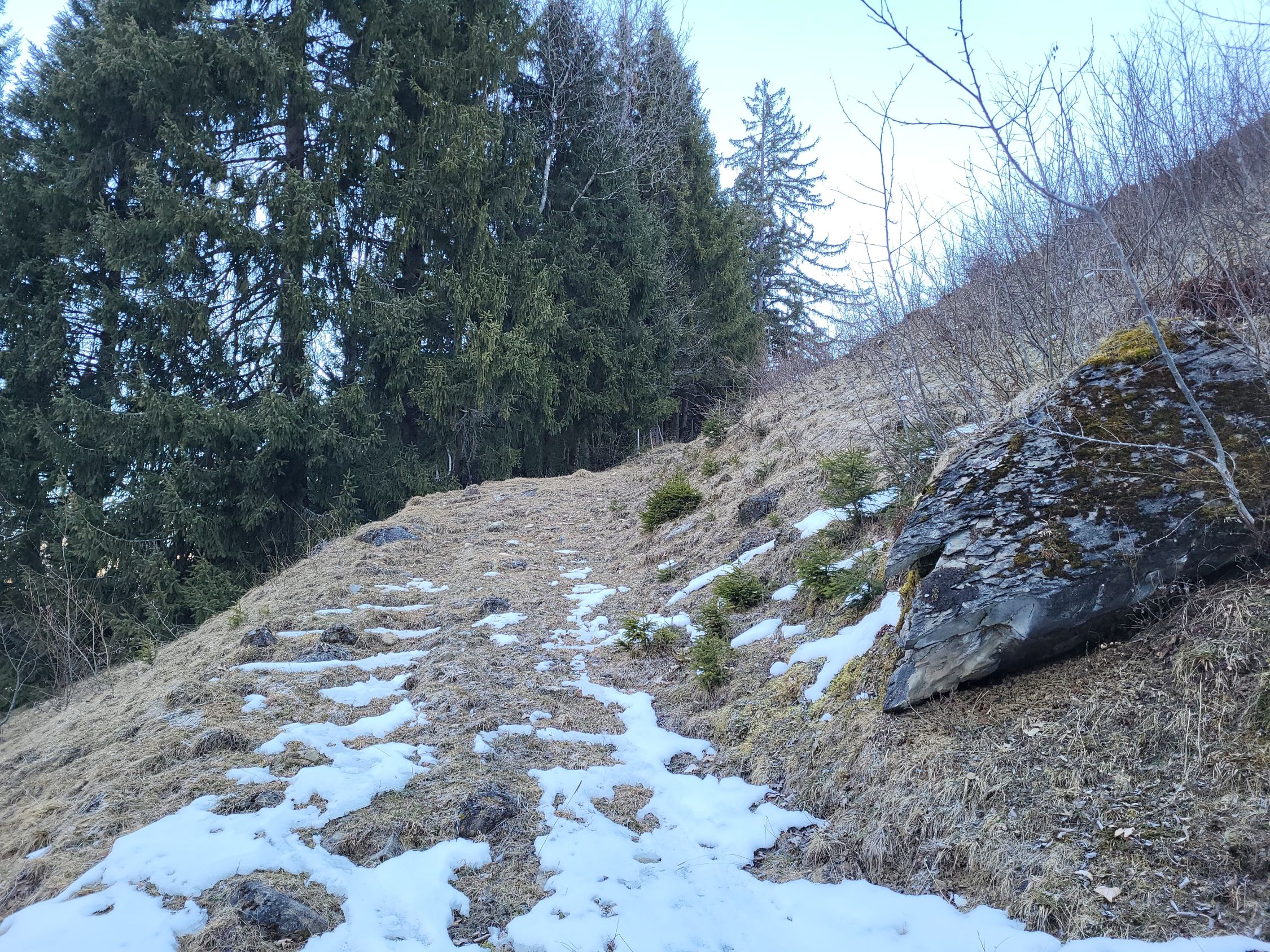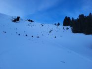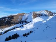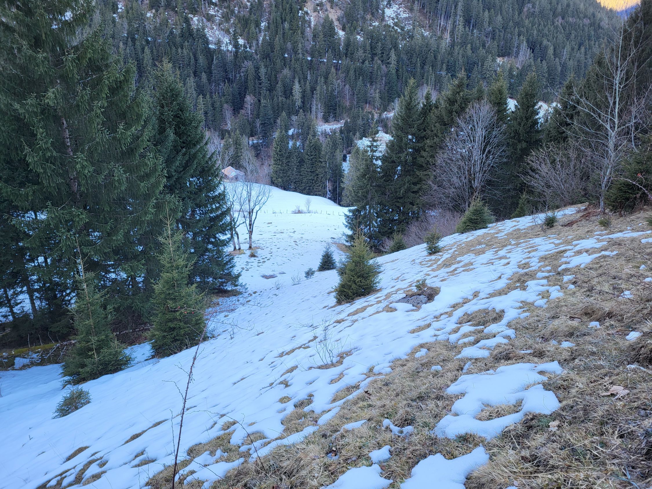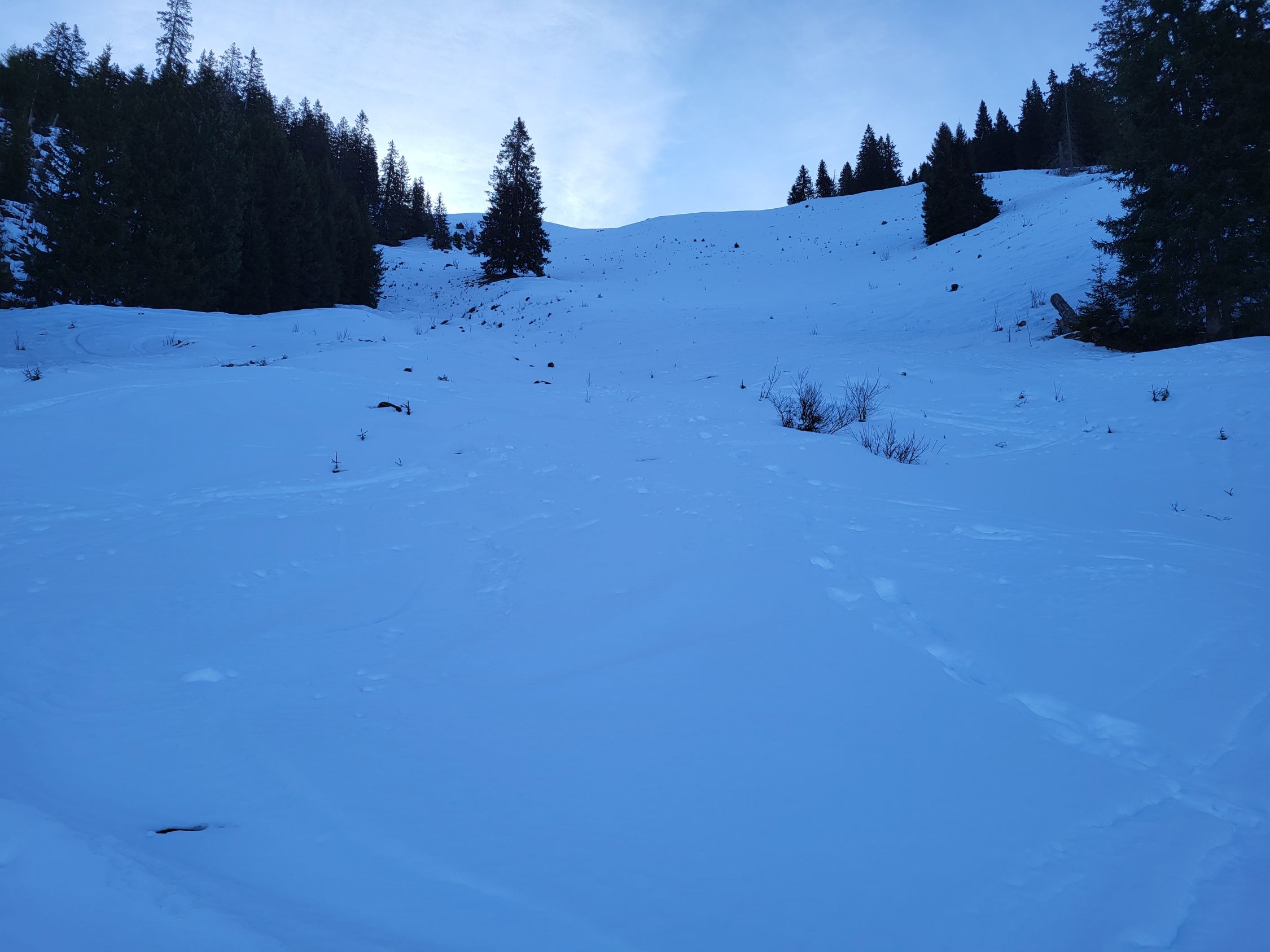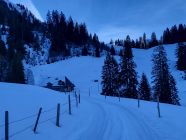 Die Abfahrt war deutlich besser als erwartet, ich habe mich von oben gesehen links gehalten (siehe GPX Track). Es hat teilweise sogar noch Pulverschnee. Ab Pt. 1834 hat es eine Pistenraupenspur bis ins Tal. Die Abfahrt auf der Strasse ging problemlos bis zum Parkplatz.