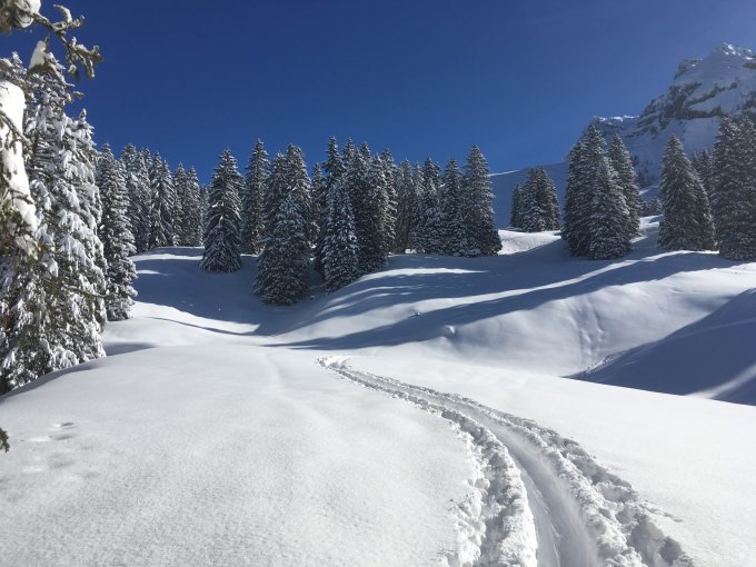 Ist sicher weitgehend auch morgen nochmals gut. Und es gibt teilweise auch noch viel Platz für eigene Lines (in der NW-Flanke nicht mehr überall...). Ok, morgen dürften die sonnigen und schon ziemlich befahrenen Hänge der Fälleggen wohl eine Kruste erhalten (also besser nicht zu früh, dann weicht diese wieder auf...)