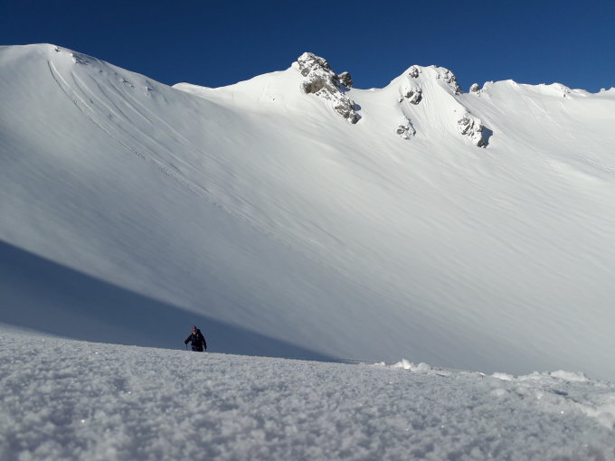 Einen grossen Dank und Kompliment an den Vorspurer, der ab Fluonalp in die 40cm Pow eine top Spuranlage gelegt hat und in einem super Tempo gespurt hat. Da sind wir nicht nachgekommen.