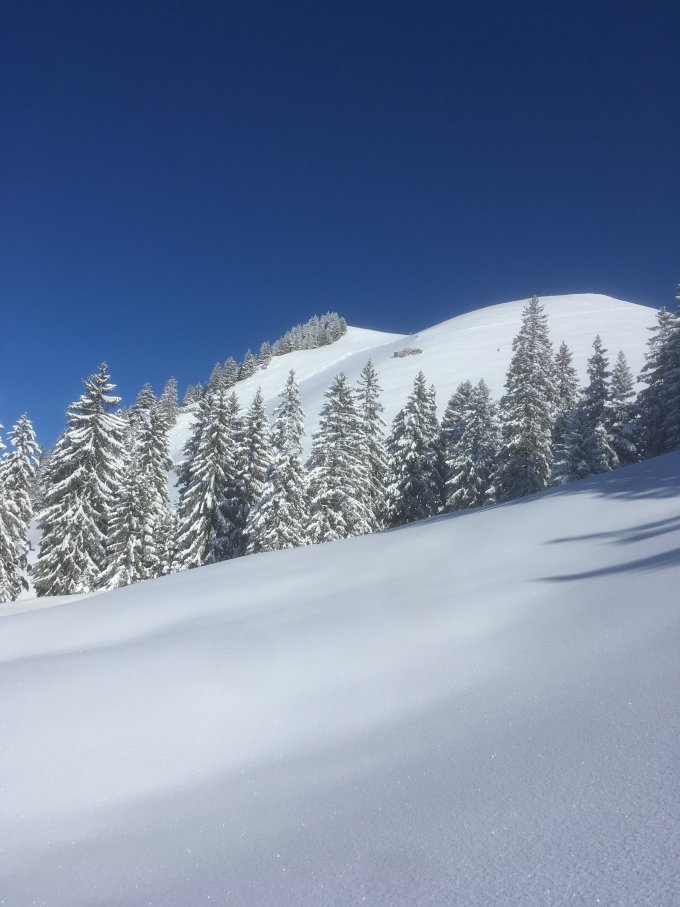 Unten ca 20 cm Pulver oben ca 30-40 cm. Abfahrt richtung Westen. So von 1300 hm abwärts ( Bärlaui) wird es ruppiger da es keine Unterlage hat und ab und zu sieht man die Wiese in den Spuren.