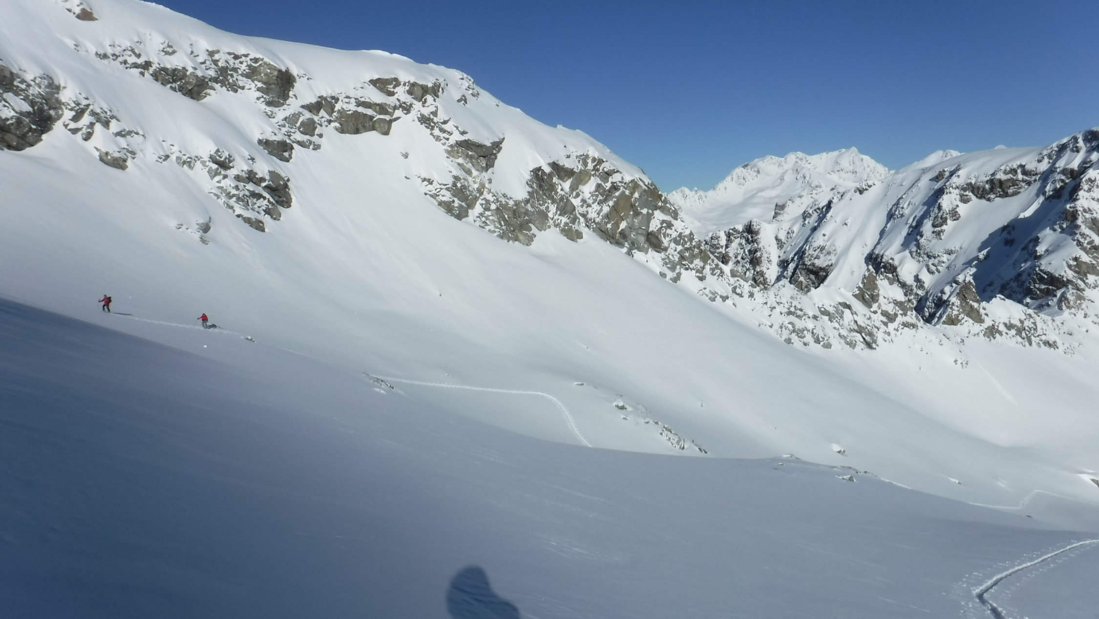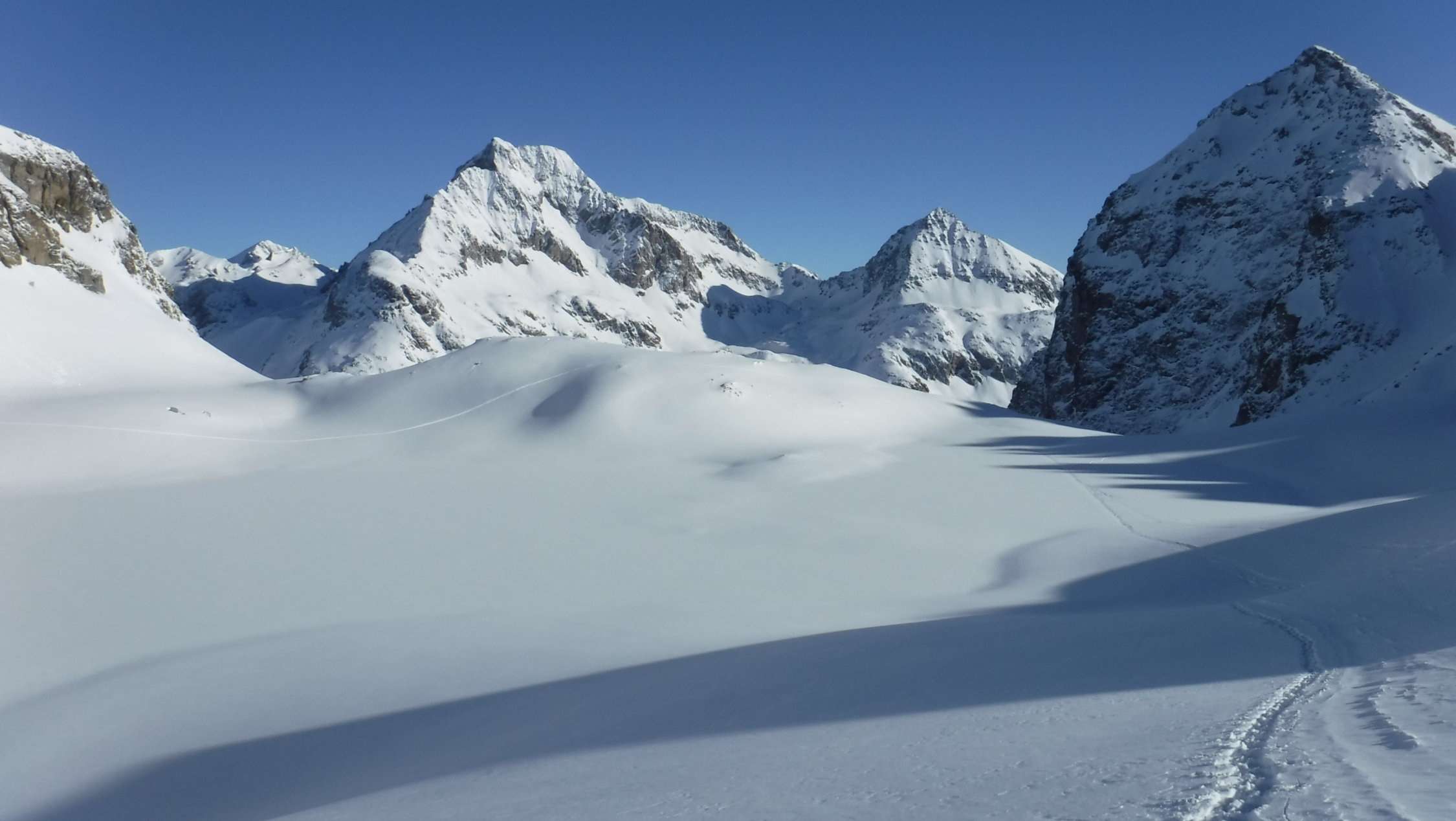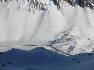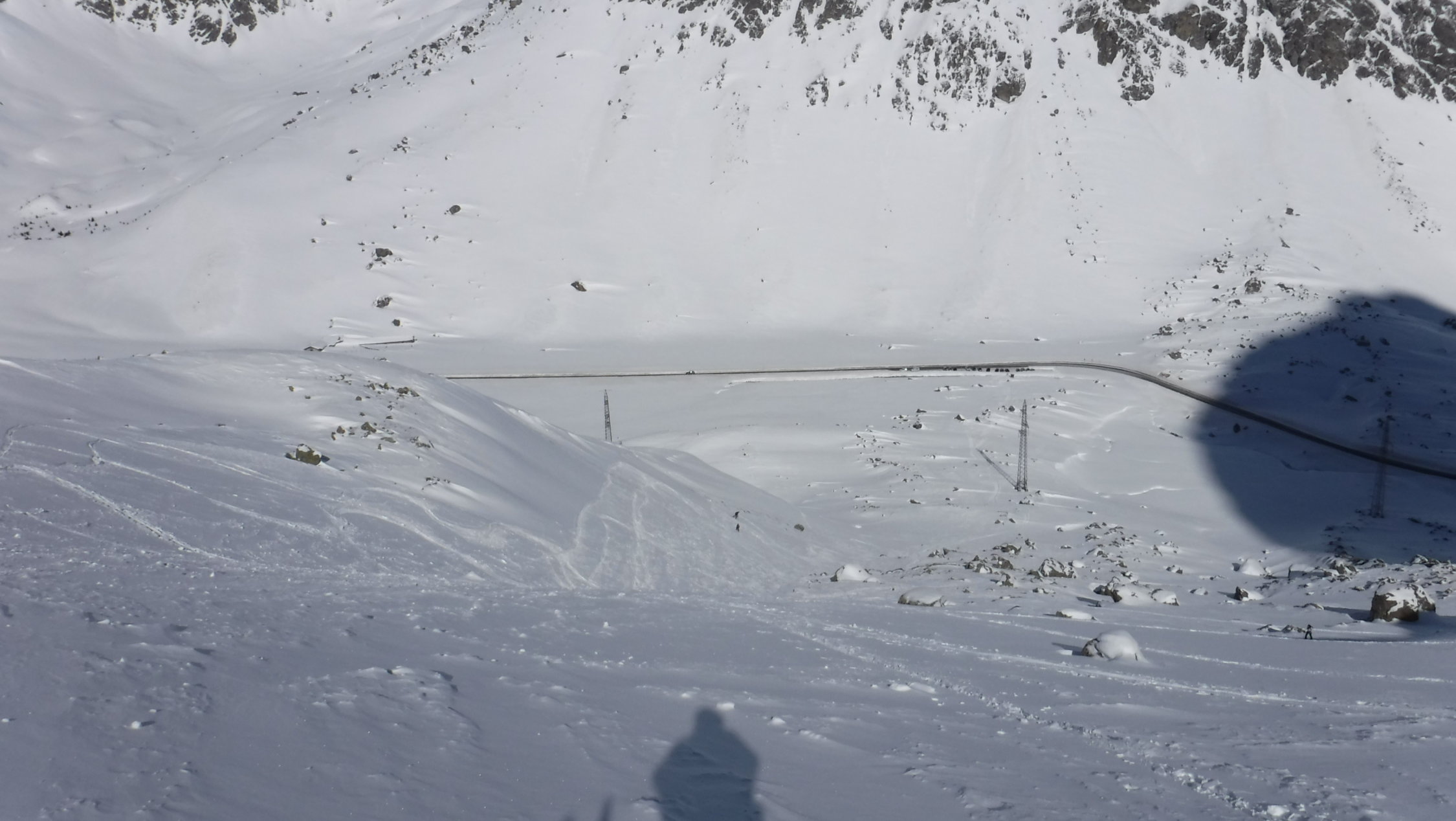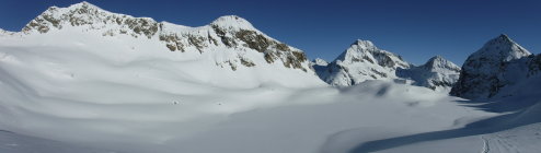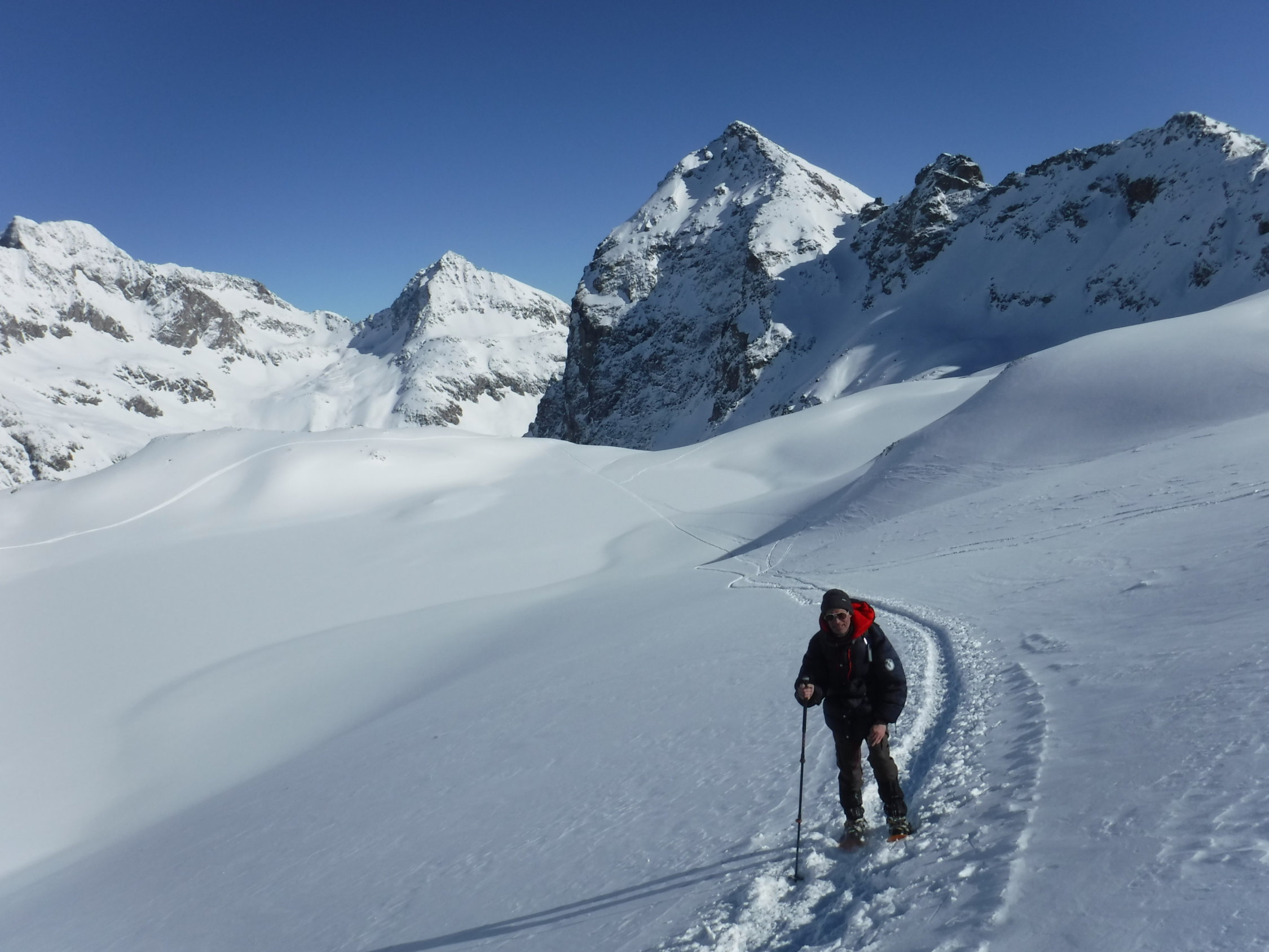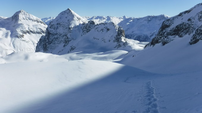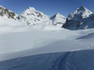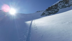 Ich war heute Morgen erster Spurenleger. Verwehte Spuren waren genug vorhanden. Ich hatte also gar keine Orientierungsfragen. Fraglich war nur das Schneeverhältnis nach dem Neuschnee und dieser Temperaturabsenkung. Diese bestätigte jedoch meine Erfahrungen: Nur LWS 2, darum warm kleiden und los ! Auf dem Lagrev-Gletscher überholte mich ein schneller Skitüerler und sauste danach hinab, bevor ich die obere Gratsenke erreichte. Im Abstieg kamen mir entgegengestiefelt: