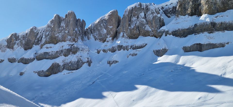Tourenticket ifenbahn 31 EUR. Gute Spur und Tritte in den Durchschlupf. Felsteil etwas eisig aber gut machbar. Ifenplateau schön tragender Schnee. Abfahrt bis Abseilstelle und mit 60m Seil abgeseilt. Die Abseilstelle ist wenn man der Abbruchkante folgt eigentlich gut zu finden. Es sind ca 150-200 längenmeter ab Gipfelkreuz. Man muss nicht irgendwo hinunterkraxeln sondern kann recht bequem von einem Art Vorsprung die Abseilfahrt beginnen. Es hat mehrrre Haken und Schlingen. Die Abseilerei ist senkrecht und luftig. Ob in einem schneereichen Winter die Abseilstelle unter Schnee verborgen ist weiss ich nicht, zur Zeit sieht man sie gut.