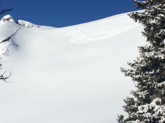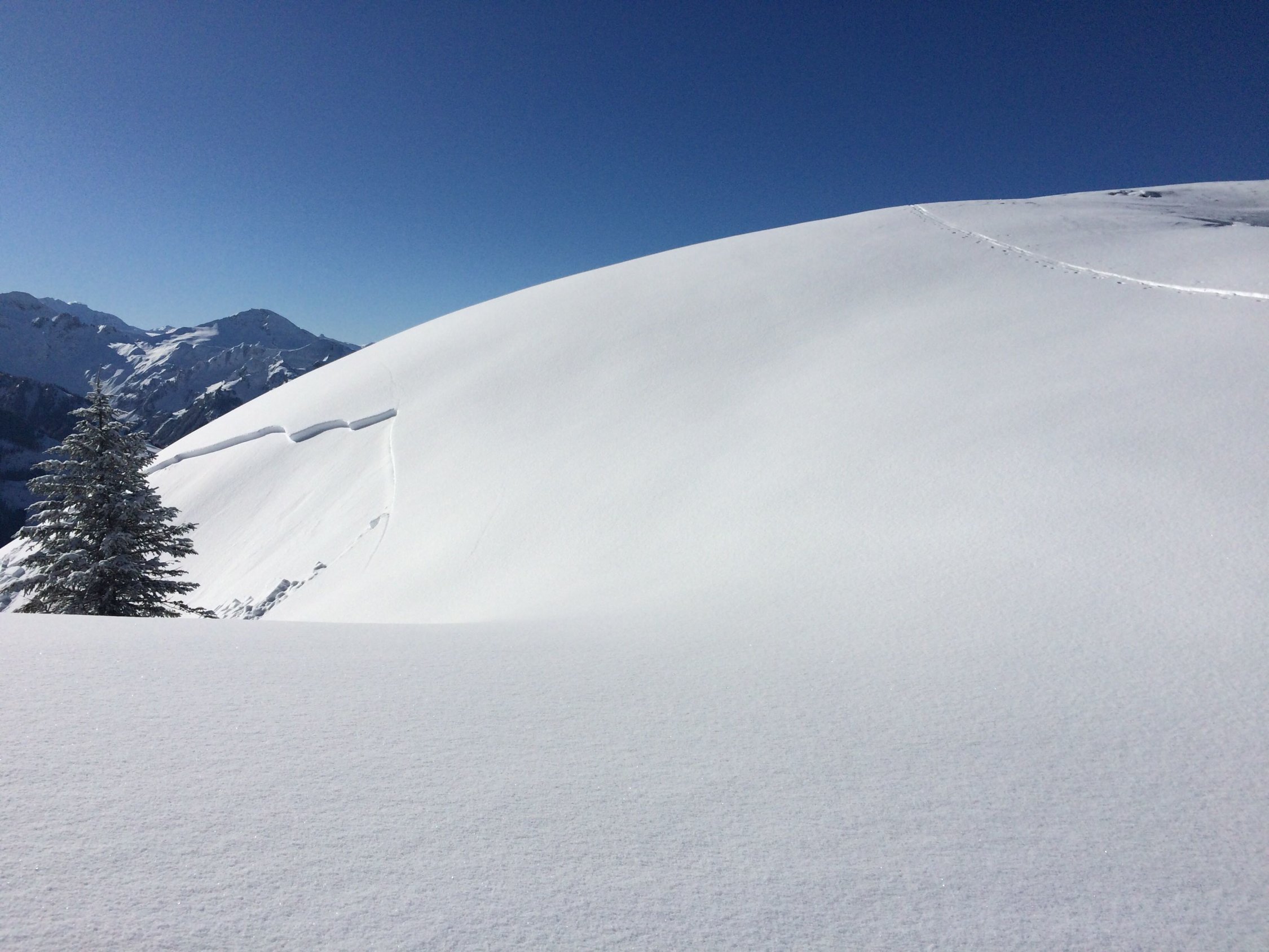 2 kleine, oberflächliche Schneebretter höchstwahrscheinlich fernausgelöst am Montag in den steilsten Passagen kurz unterhalb des Turnen-Gipfels, Hangexpos beide SO, Höhenlage ca. 1900m.ü.M.