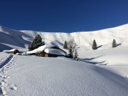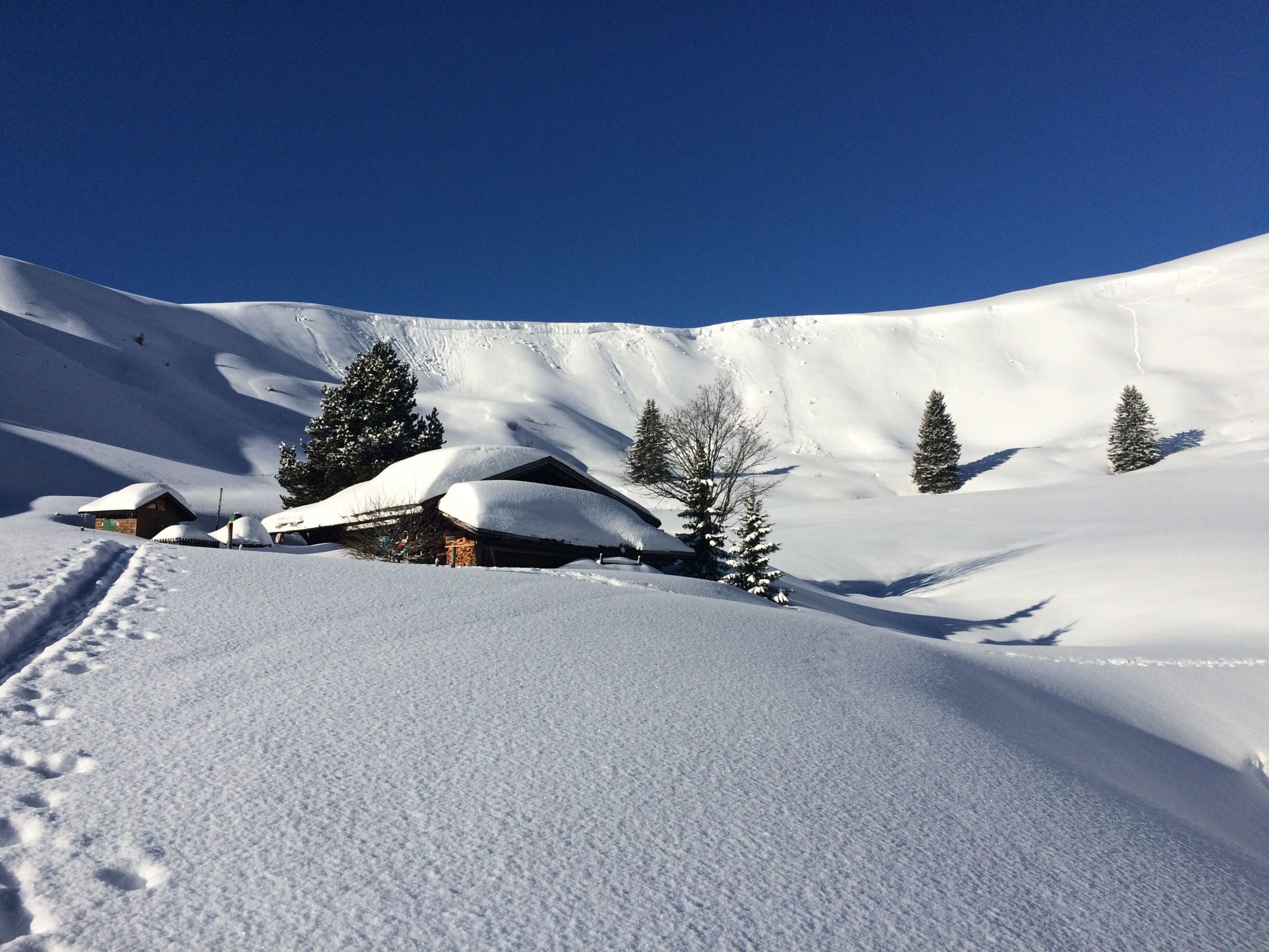 Eiskalter Start in Zwischenflüe, auf 5 cm frischen Schnee (dürfte mit der Sonneneinstrahlung schon wieder weg sein) über Gras und Maulwurfshügeln zum Gandgraben, im zweiten Teil Gandgraben dann eine Altschneeschicht, ging mit weniger Gemurkse als auch schon. Allerdings liegt an einer Stelle eine gestürzte Tanne quer und bedingt ein Umgehungsmanöver. Nach Gandgraben links ausholend +/- via Hütten von Obers Blaachli auf den Rücken und so zur Alphütte Vordertärfet, etwas weiter als die Normalvariante aber weniger Murks, die Wächte unterhalb der grossen Alphütte "Spicherböde" ist doch einigermassen steil und hoch aufgebaut. Neuschnee ab Vordertärfet 30 bis stellenweise eingeblasen 40 cm. Oben nach dem Wald zwei oberflächliche Fernauslösungen durch Einzelskitourengänger vom Montag (verg. Fotos), ich selbst hatte zwei "Wumms", aber ohne Auslösungen.
