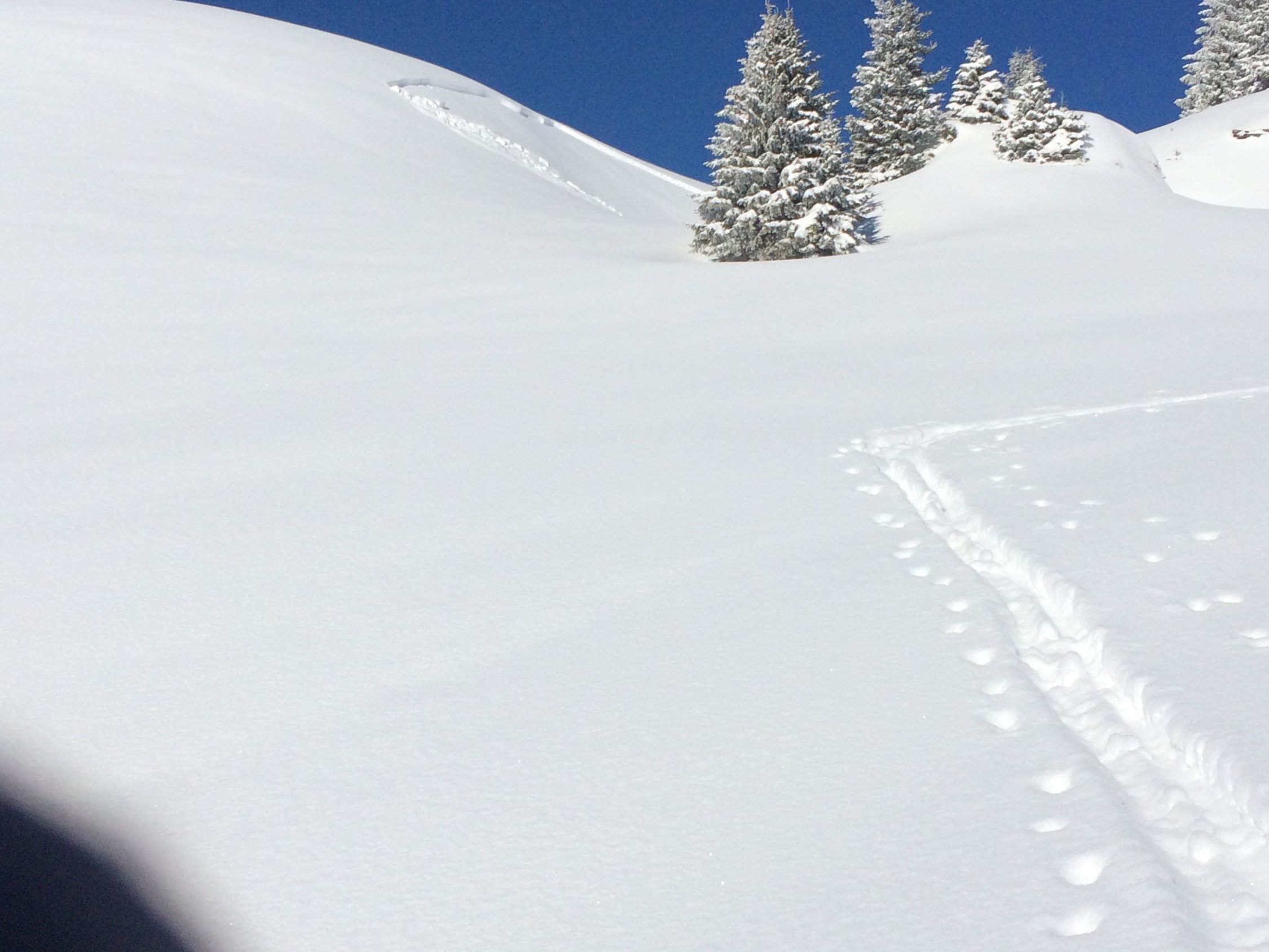 Abfahrt Westhang Turnen sensationell - unverblasener, unverkrusteter fluffiger Pulver auf tragender und nicht ruppiger Unterlage.