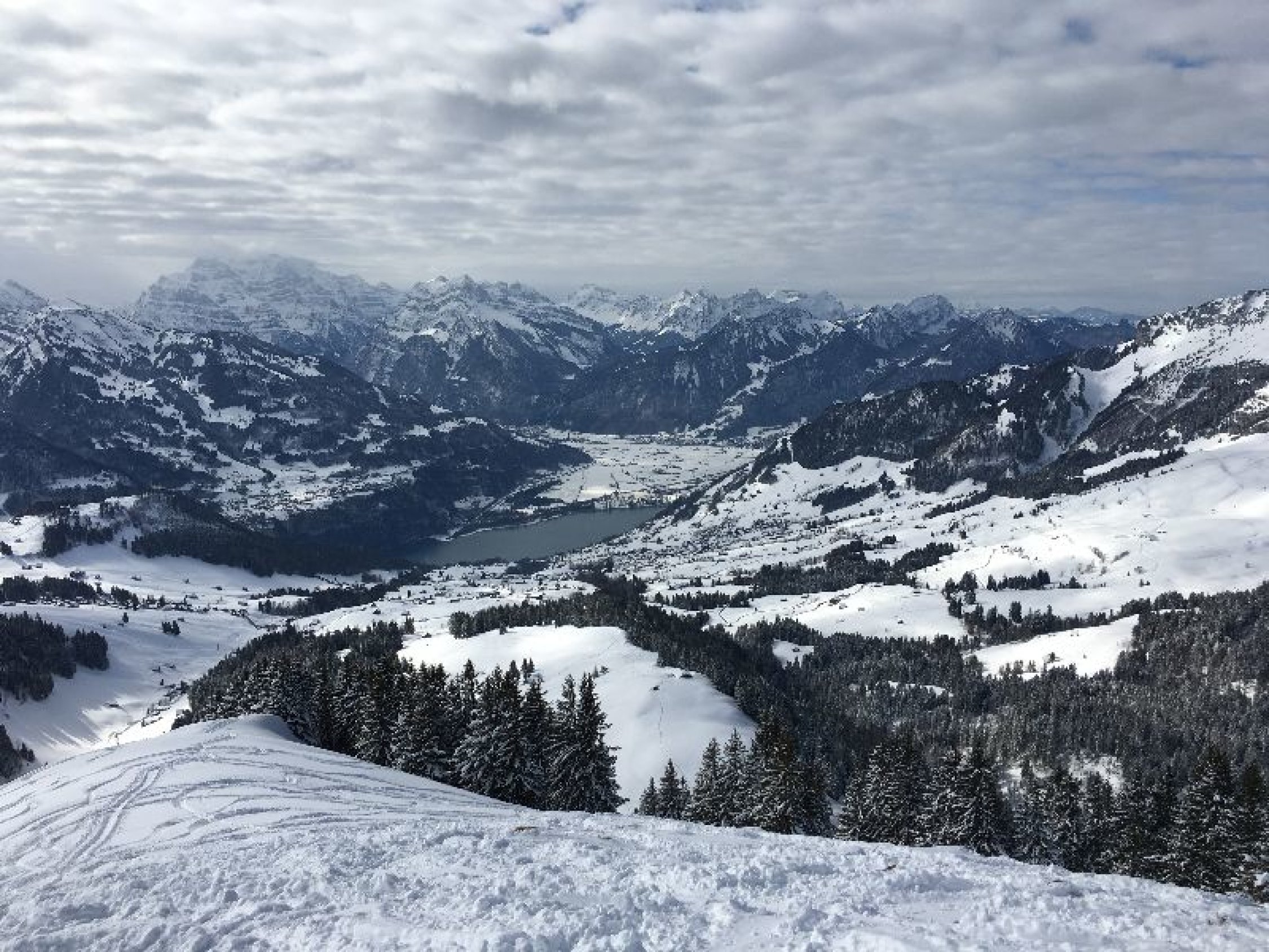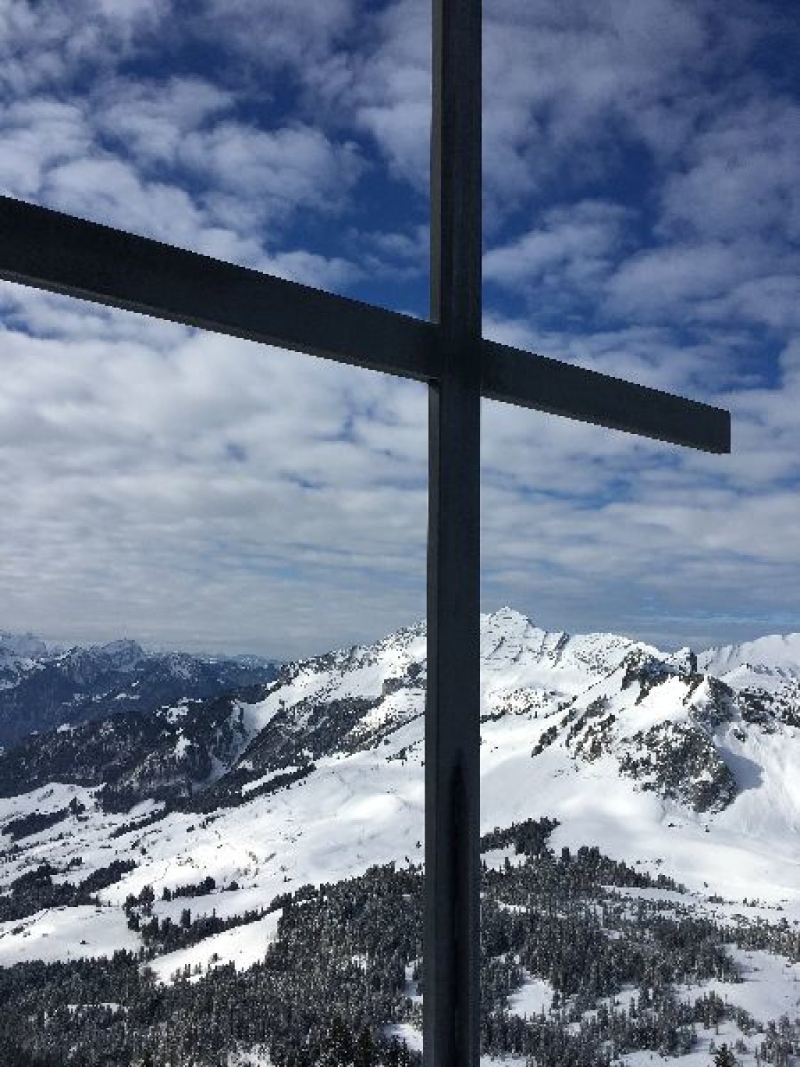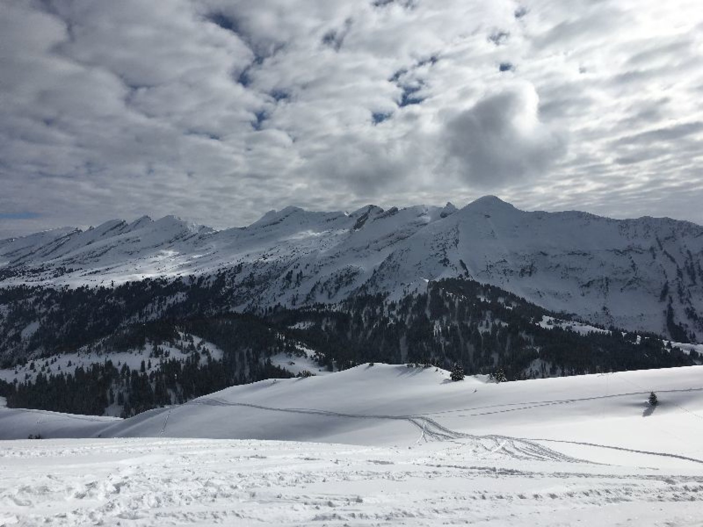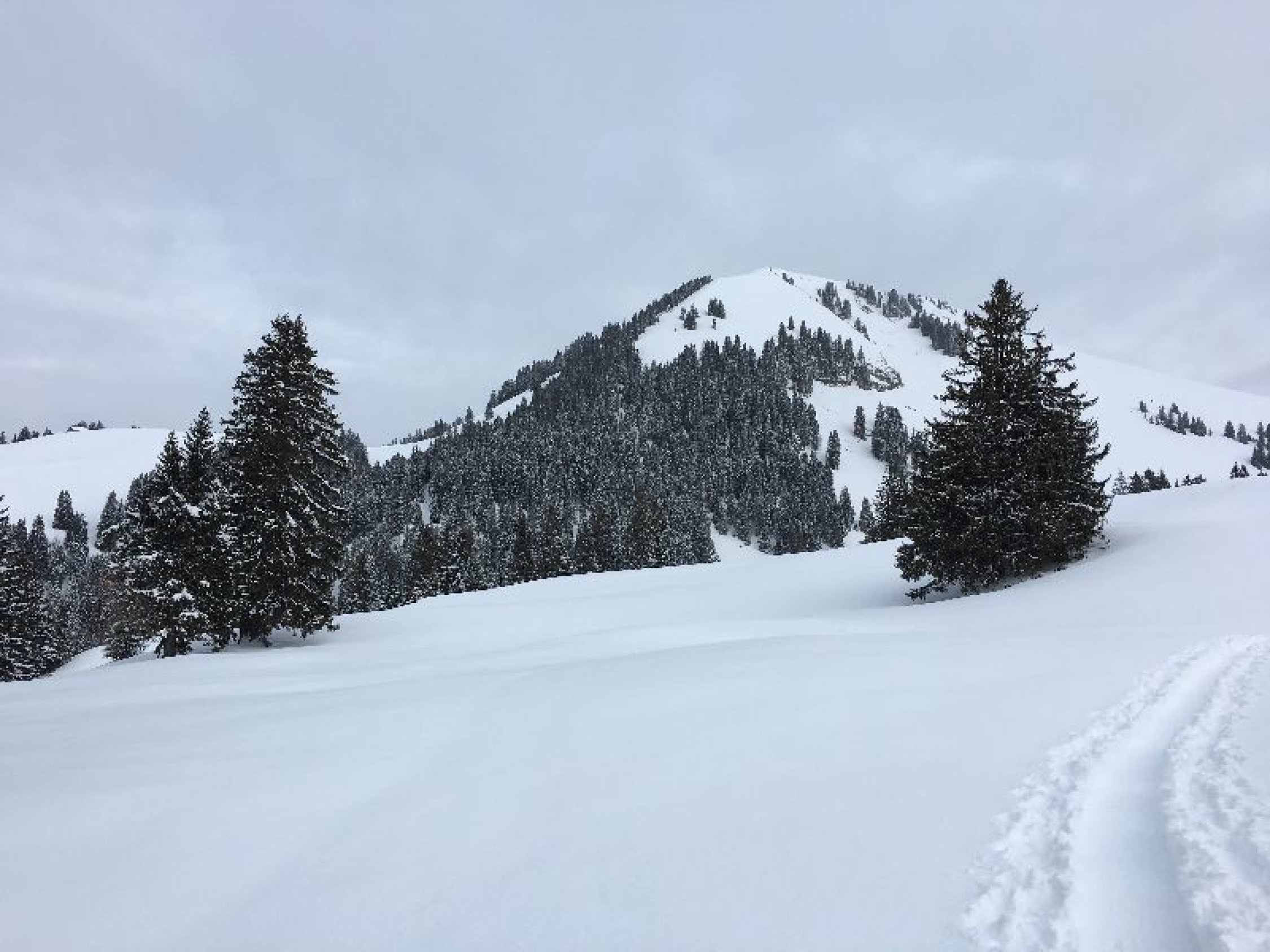etwa 30 cm Pulverschnee auf der gesammten Route. Steile Aufstiegsspur im unteren Teil des Ostgrates vom Vortag. Ist wohl den Schneeverhältnissen geschuldet. Sehr viele Spuren im Gipfelhang hinunter nach Tscherwald.
