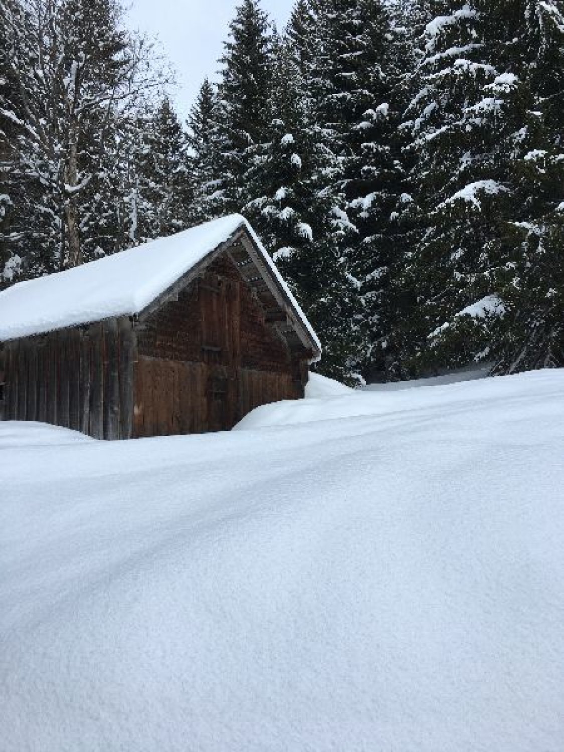 Alte und teilweise eingeschneite Schneebretter im Egg und Chäl.