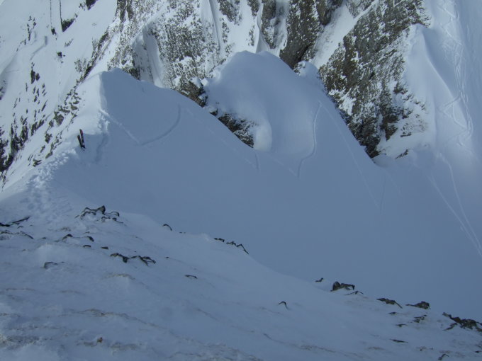Bis zum Sattel war am Vortag schon gespurt. Der tiefe Gipfelaufstieg blieb mir übrig. Aufstieg mit Ski bis 15m unter Gipfel. Sehr steil mit >40°, aber stabil.