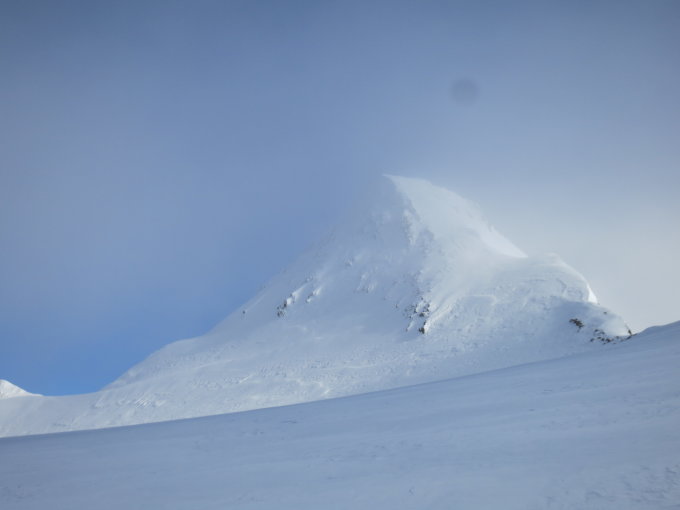 Gipfelaufbau tief verschneit, immer wieder in den Wolken, Wind, richtig kalt - so sind wir mit Ski auf den einfacheren Nebengipfel im Südwesten des Gipfels (Pkt. 3128müM).