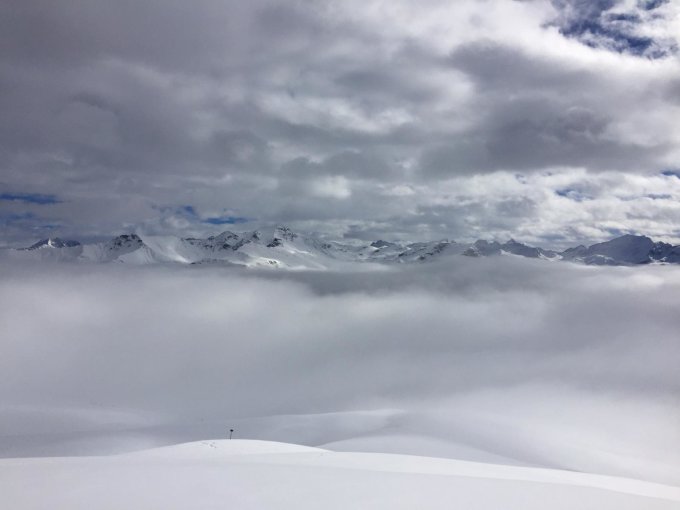Runterfahren war ein Kampf. Der Schnee hat übelst gebremst. Falls der nasse Neuschnee gefriert, wird das ein übelster Bruchharst geben. Ab 2200m leider null Sicht und Orientierung schwierig. Unten besser zum Skifahren.