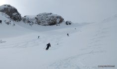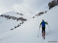 Zuerst bleiche Sonne. Dann zog es zu. Um 13 Uhr begann der Niederschlag. Oberhalb 1400 m Schnee, darunter mässiger Regen. Die Neuschneeauflage ist sehr feucht. Darunter hats eine gute Unterlage. Auf den letzten 200 hm zum Gipfel gabs grosse Stollen an den Fellen.