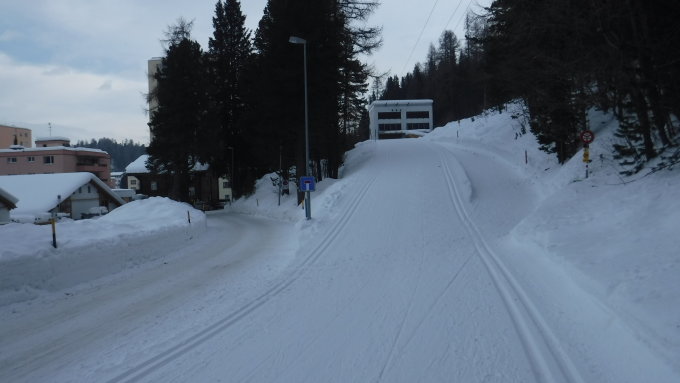 Unten deutliche, bzw. oben verwehte Skispuren vorgefunden. Stellenweise oben und im Kessel völlig weggeblasen. Bergrücken oben abgeblasen und verwächtet. Im Kessel und im Tobel westlich des Spuondas Rosatsch noch pulvrig. Im Wald jedoch schon verkrustet.