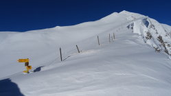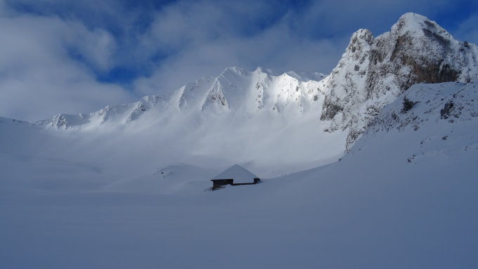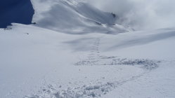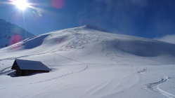 Nachdem es gestern bis 2000m Regen gegeben hat und in der Nacht wieder kälter wurde schneite es noch 10-15cm Neuschnee auf die teils harte und teils leicht brechende Unterlage.