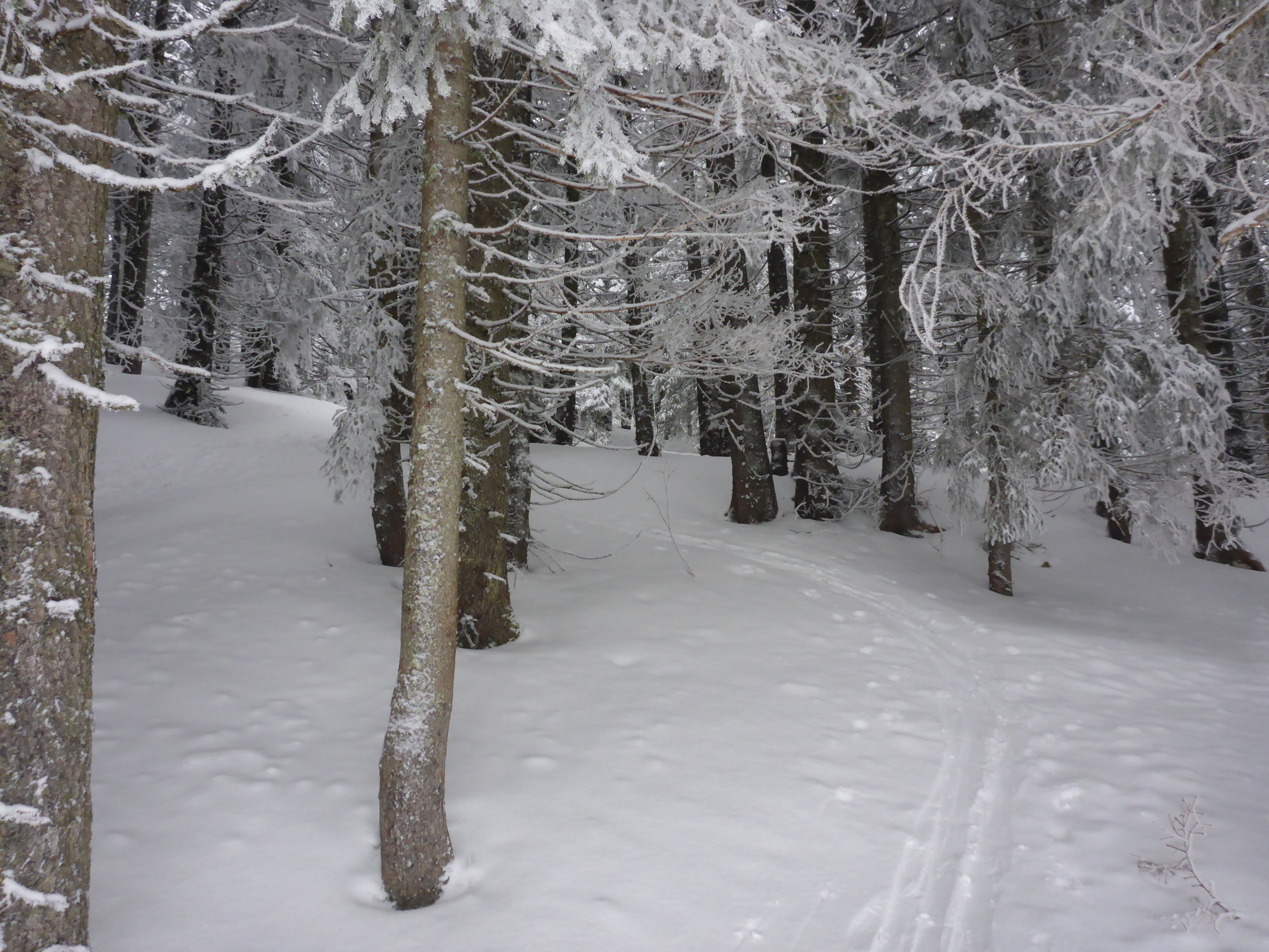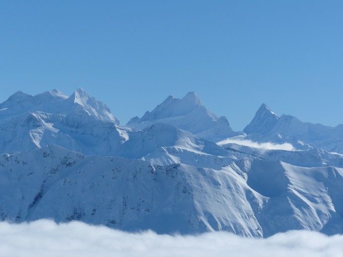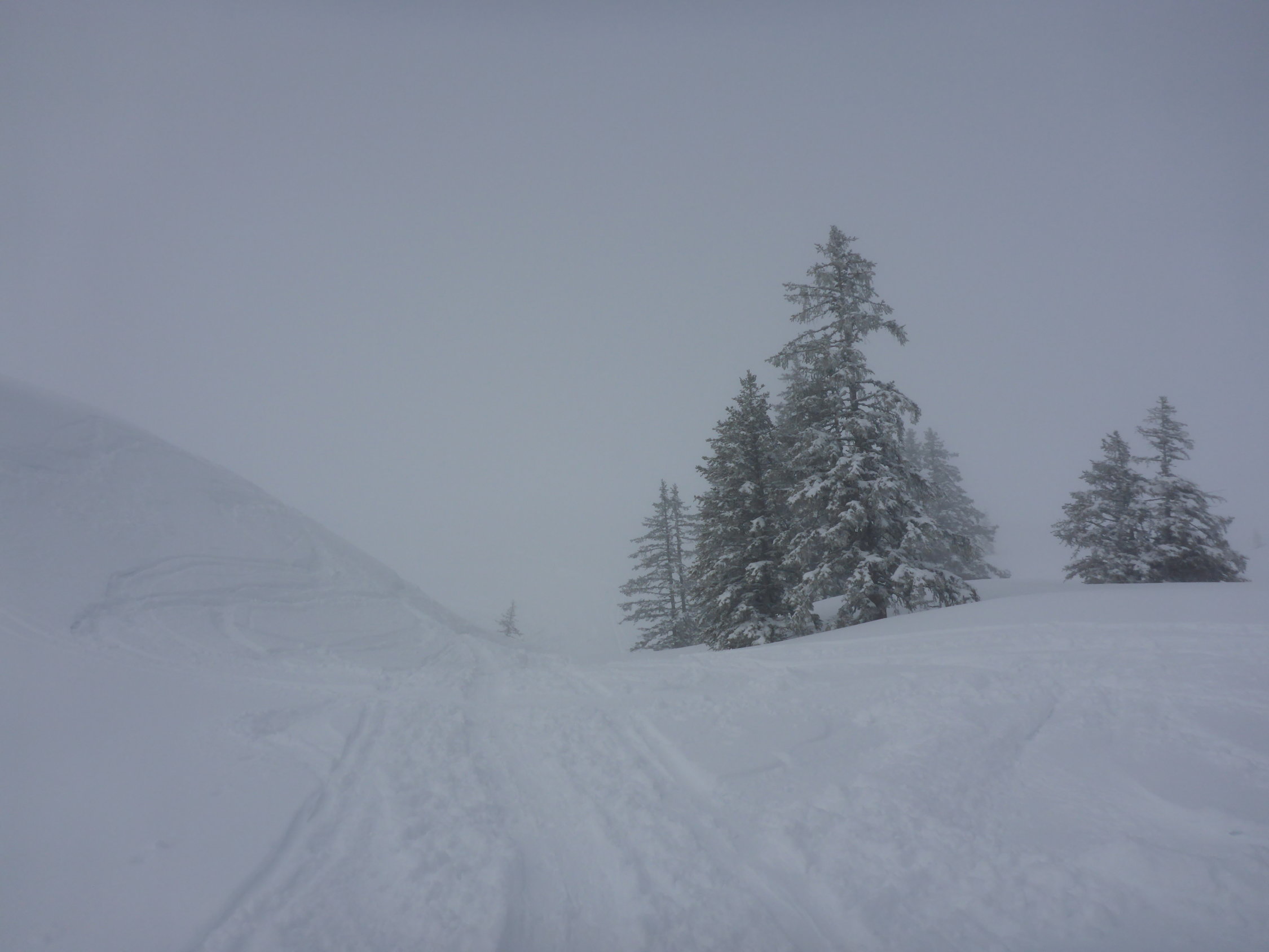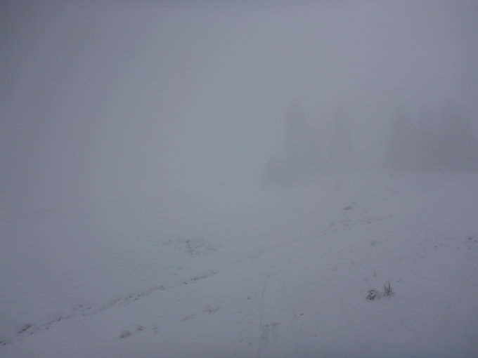 Der Nebel hielt sich hartnäckig und löste sich erst auf einer Höhe von ca. 1800 m richtig auf. Aufstieg auf Neuschnee der letzten Nacht, ca. 10-15cm - ob der Waldgrenze etwas mehr.Bis ca. Schlund eher nasser Schnee, dann zunehmend pulvriger.
