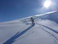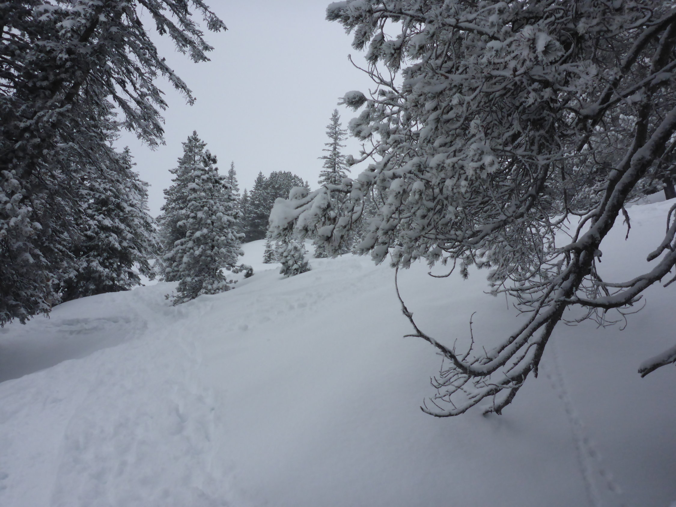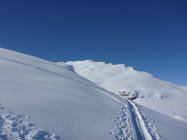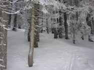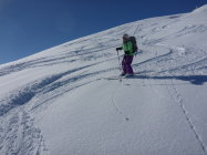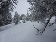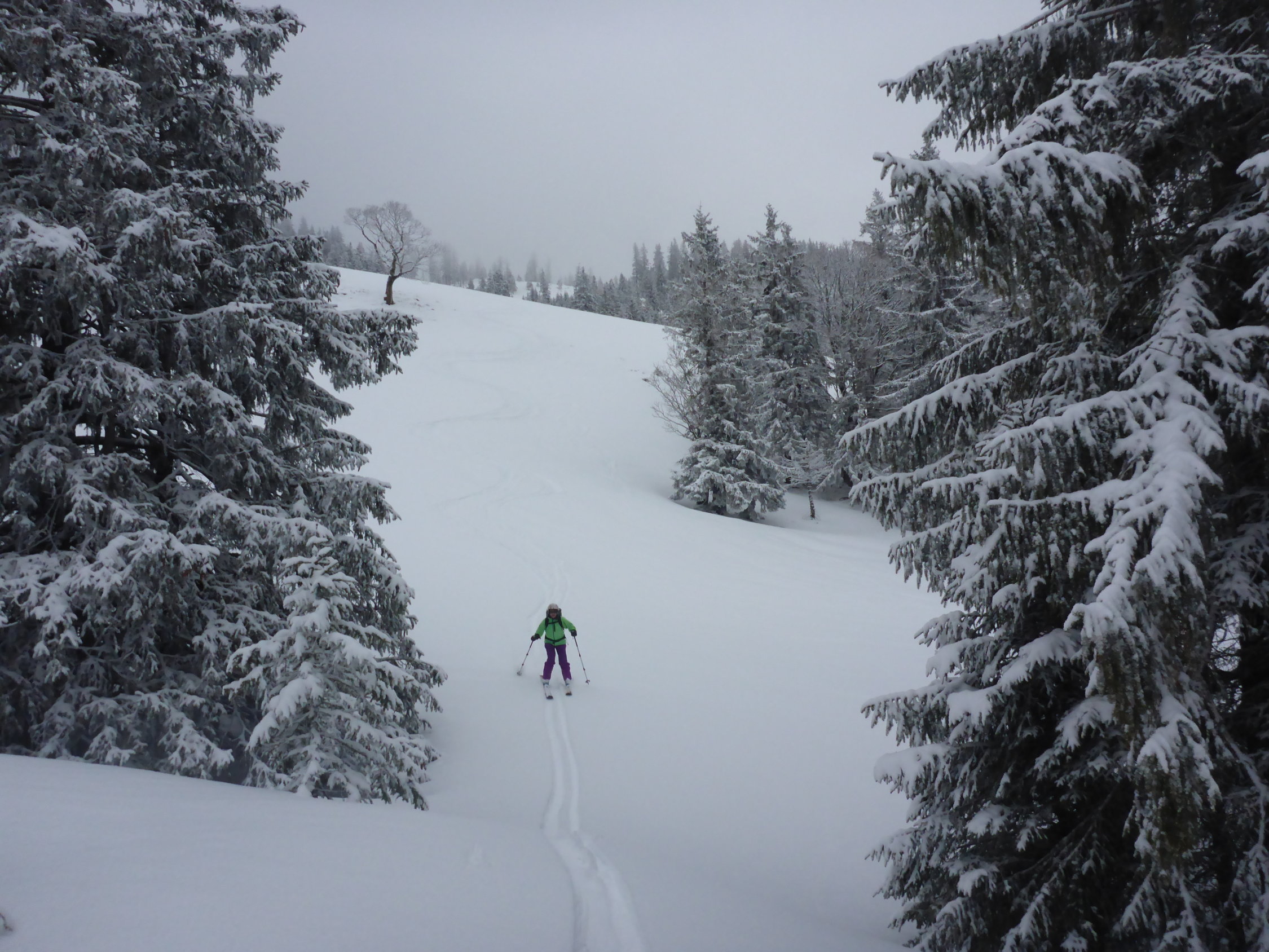 Angenehmer Aufstieg im Wald, herrlich die Stimmung im Moment. Oben dann Gipfel nicht gemacht und uns auf die Abfahrt konzentriert. Wunderbare erste Schwünge bei guter Sicht und Powder vom feinsten... Im Wald dann eher schwerer Schnee, aber alles gut drehbar. Es hat sich gelohnt durchzuhalten.