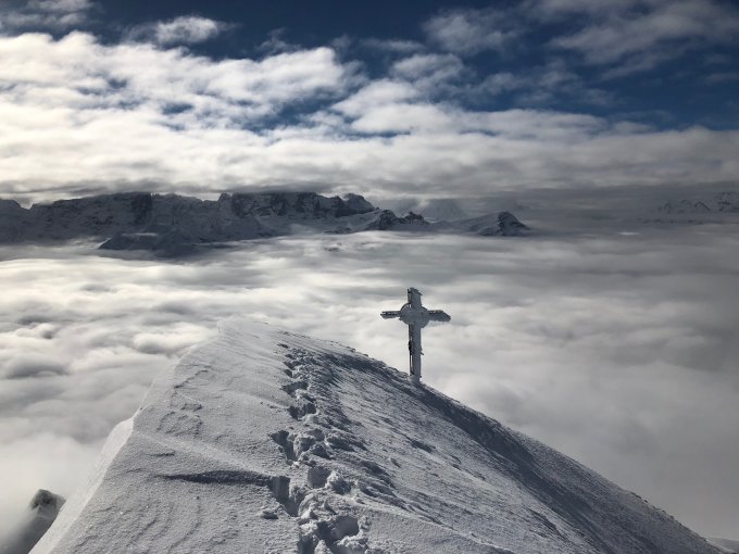 Von der Seilbahn weg ausgezeichnete Unterlage und min 15cm lockerer Neuschnee auch tragender Unterlage. Nur der Gipfelaufbau wie üblich abgeblasen, aber gut auch ohne Harscheisen zu bewältigen.