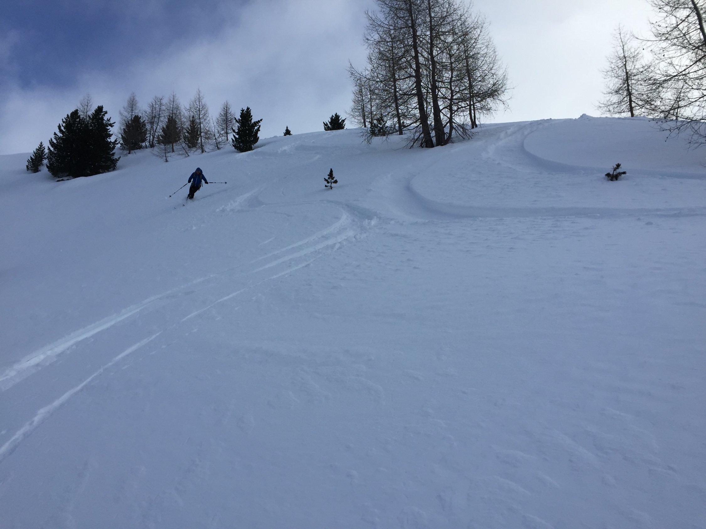 Die unteren Hänge und der Forstweg bis zur Galleralm sehr ausgefahren. Weiter Richtung Hochrast ist die Tour gut eingespurt und der noch sehr schöne Pulver in den nordseitigen Hängen hat auch schon einiges an Publikumsverkehr gesehen. Zwischen den lichten Baumständen hat es jedoch noch reichlich Platz für eigene Kurven.