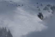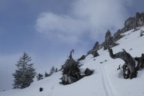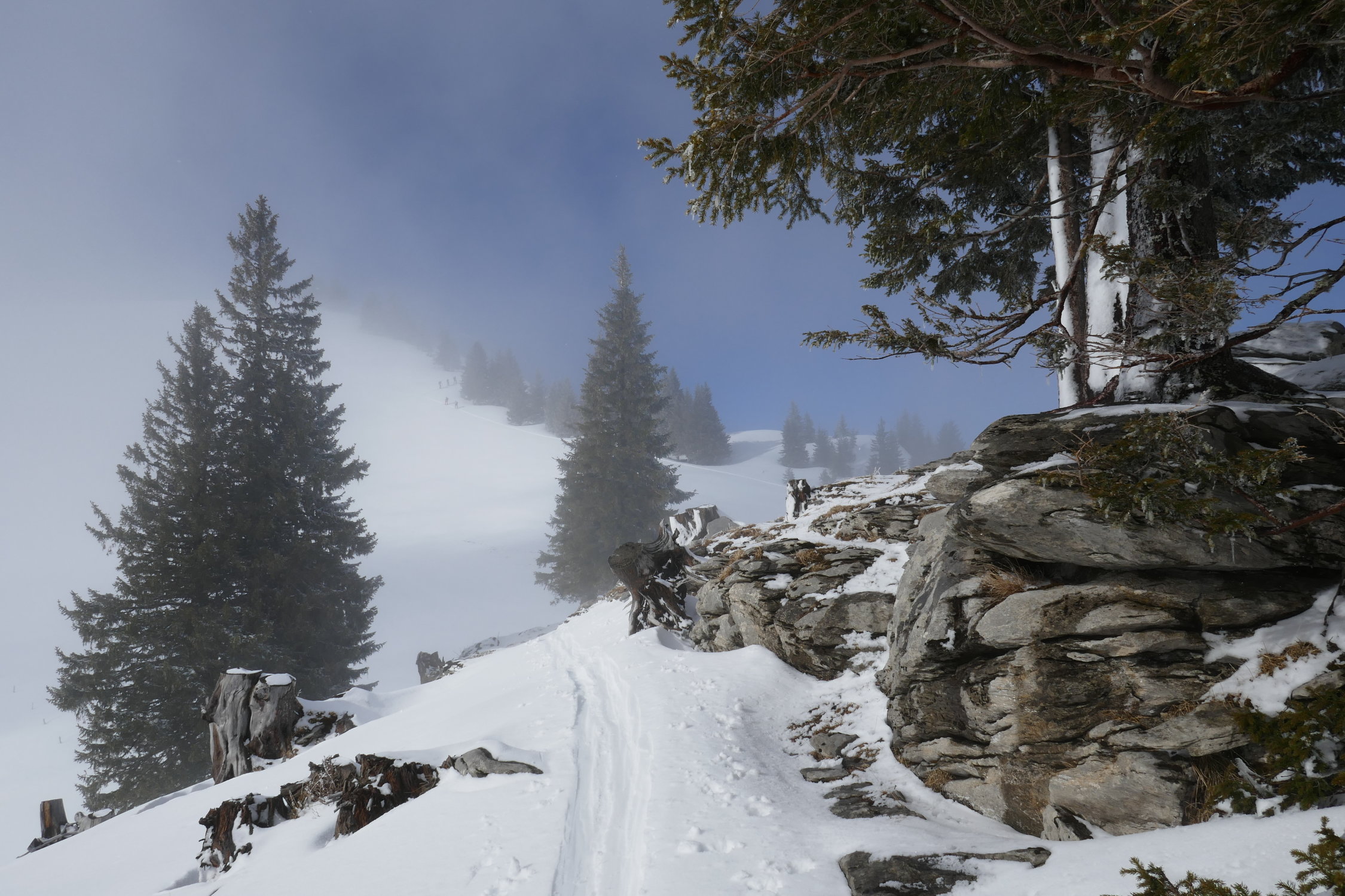 Aufstieg via Gandgraben zur Rindere: Schnee ab Kreuzung 1397 MüM, darunter nur stückweise. 3 gestürzte Tannen etwas unterhalb dieser Stelle erfordern ein bisschen Beweglichkeit.