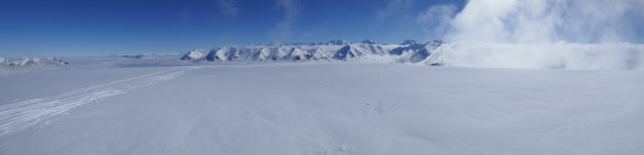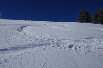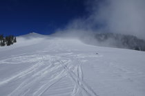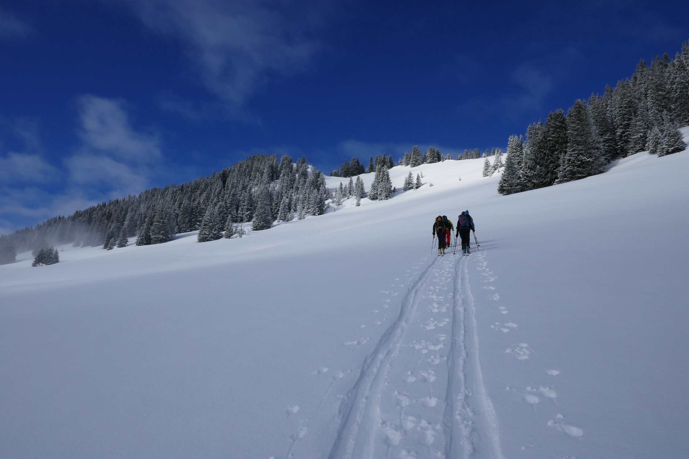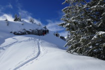 Aufstieg via unteres Blachli auf der Strasse: Ab der oberen Kiesgrube ging es teilweise auf Schnee. Beim oberen Blachli sticht man am besten auf Höhe der Strasse in den Spicherbodekessel. Die Wächte unterhalb ist sehr gross.