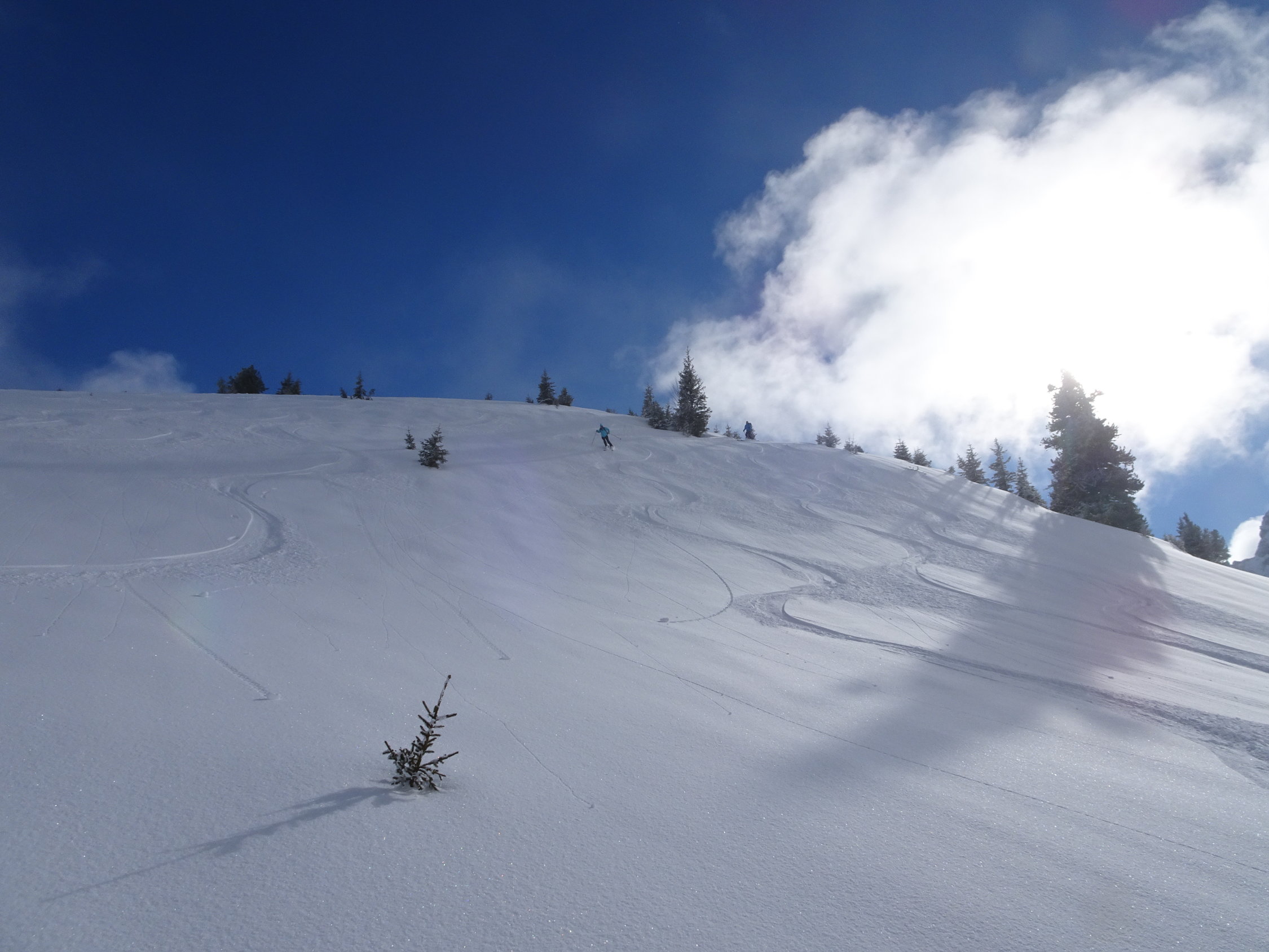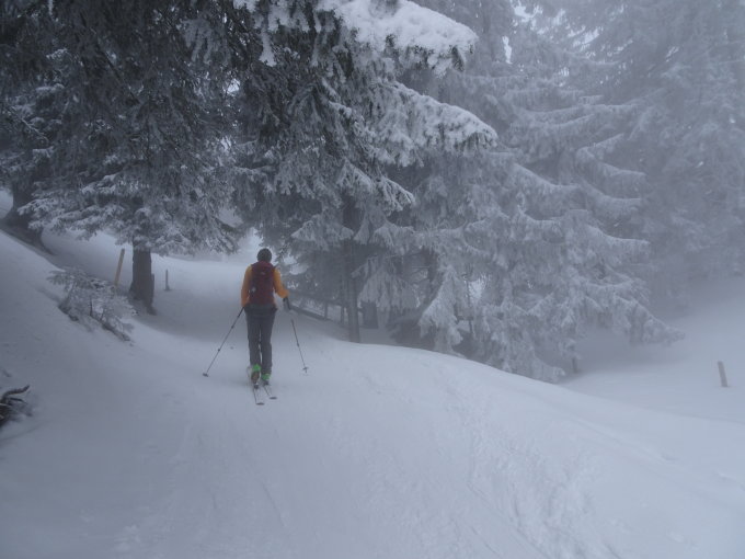 Waldweg tiptop (immer noch Variante links der grossen Lawine wählen). Darüber von 1600-1800 im dicken Nebel. Die paar cm Pulver hat es im Nebel ziemlich gebacken, das geht Richtung Nassschnee, Unterlage nicht überall tragend. Prädikat: "schaffig". Oberhalb 1800 meist über dem Nebel, ca 5cm Pulver auf tragender Unterlage. Herrlich zum schauen, herrlich zum fahren, das meiste jetzt wohl aber verfahren.