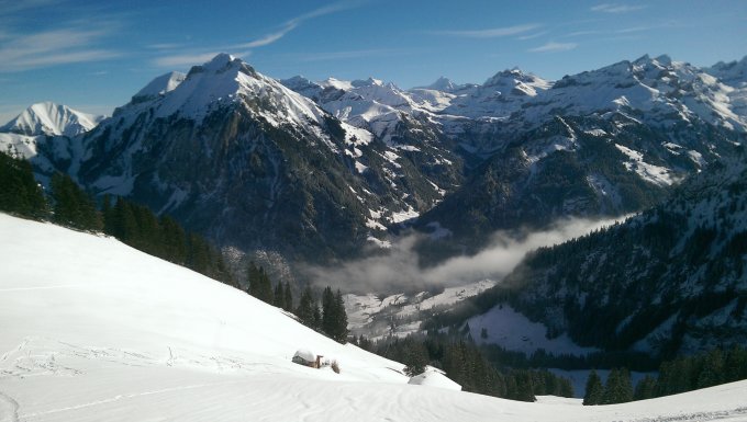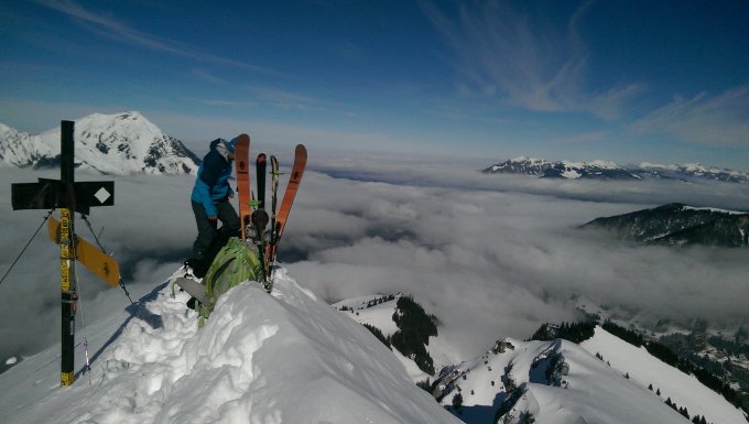 Abfahrt vom Gipfel um 12:15. Oben auf harter, tragender Unterlage 5-10 cm Pulver. An Südosthängen und unterhalb 1600 m Sulz/zunehmend Übergang zu Nassschnee.