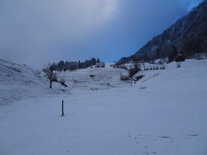 Im Abstieg bis Stockneregg recht gut, dann auch abgeblasene Stellen, so dass Braun-Grün hervorschaute. Auf den letzten 200hMt. hinunter nach Stein habe ich die Schneeschuhe getragen…