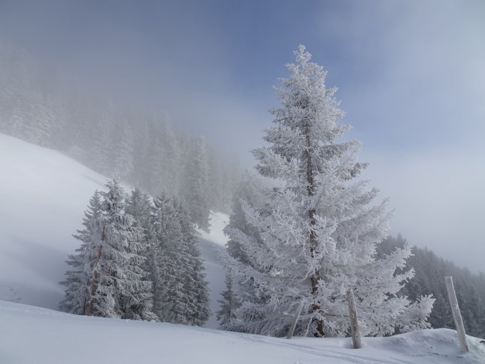 Bis ca. 1100 Meter sehr wenig Schnee und immer wieder Grund- (Graskontakt). Dann mehr Schnee und Spuren vorgefunden. Weiter über Risipass und durch die Waldschneise zum Gipfel bei guten winterlichen Verhältnissen. Am Gipfel wartete die lang ersehnte Sonne!